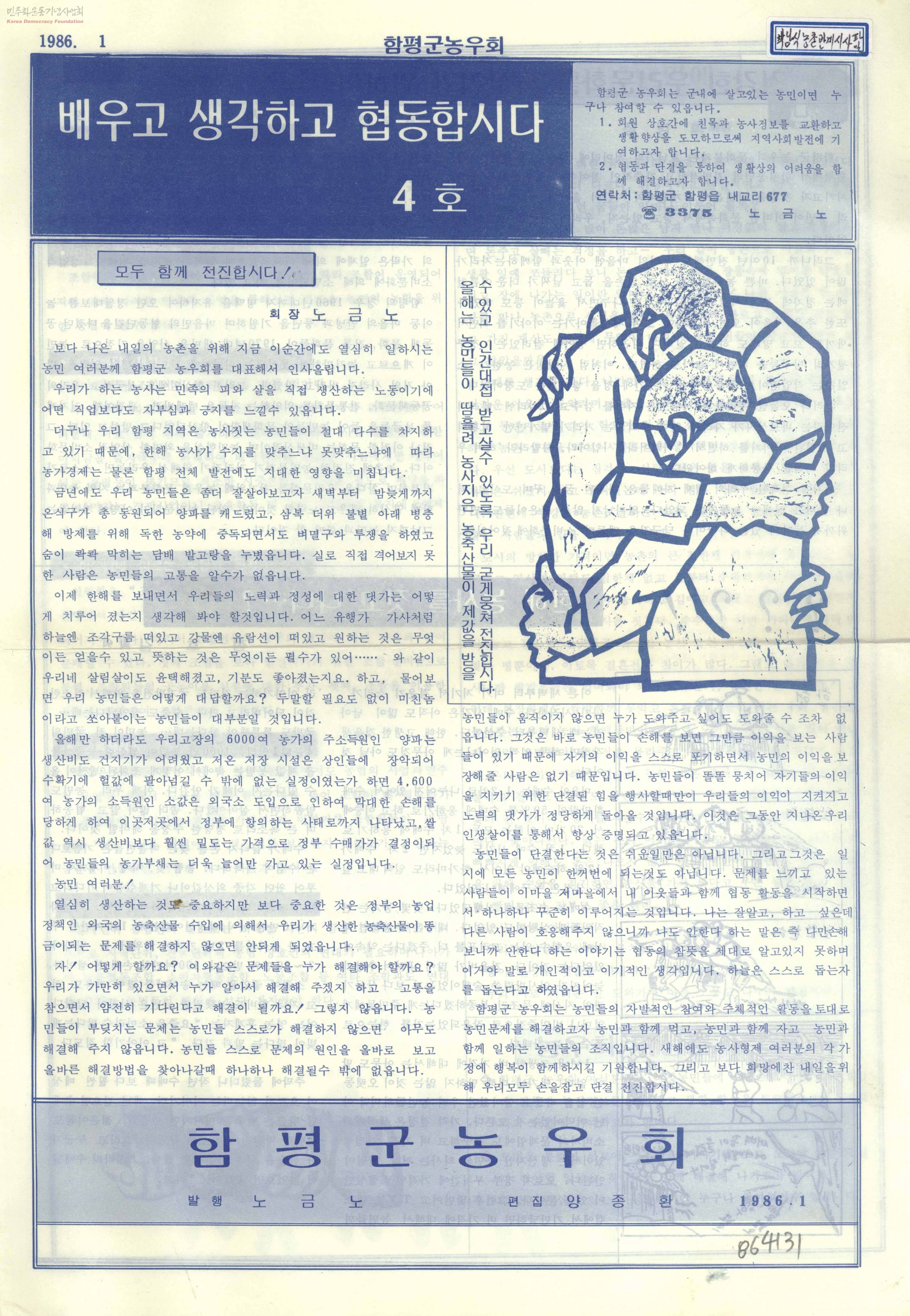 - 농민스스로의 단결과 협력으로, 농민의 권익을 옹호하고, 농촌과 사회의 민주화에 기여한 농민운동단체인 함평군농우회 소식지 - 모두 함께 전진합시다! - 건강한 우리문화를 되살리기 위하여 - 한해 농사를 짓고 나니...? 등.