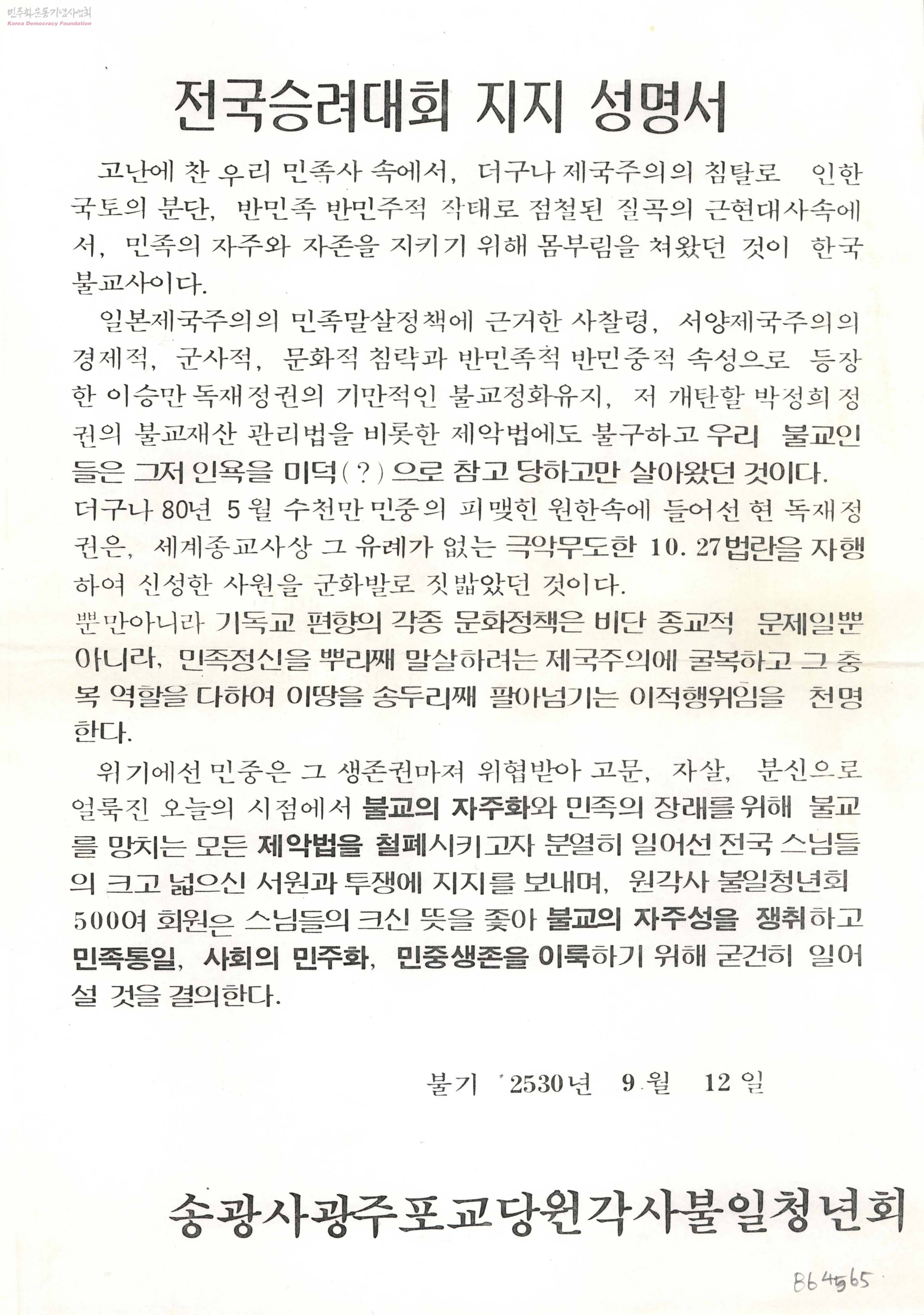 - 전국승려대회에 대한 지지를 표하며 사건의 조속한 해결을 촉구하는 내용 불교의 자주성을 쟁취하고 민족통일, 사회의 민주화, 민중생존을 이룩하기 위해 굳건히 일어설 것을 결의한다.