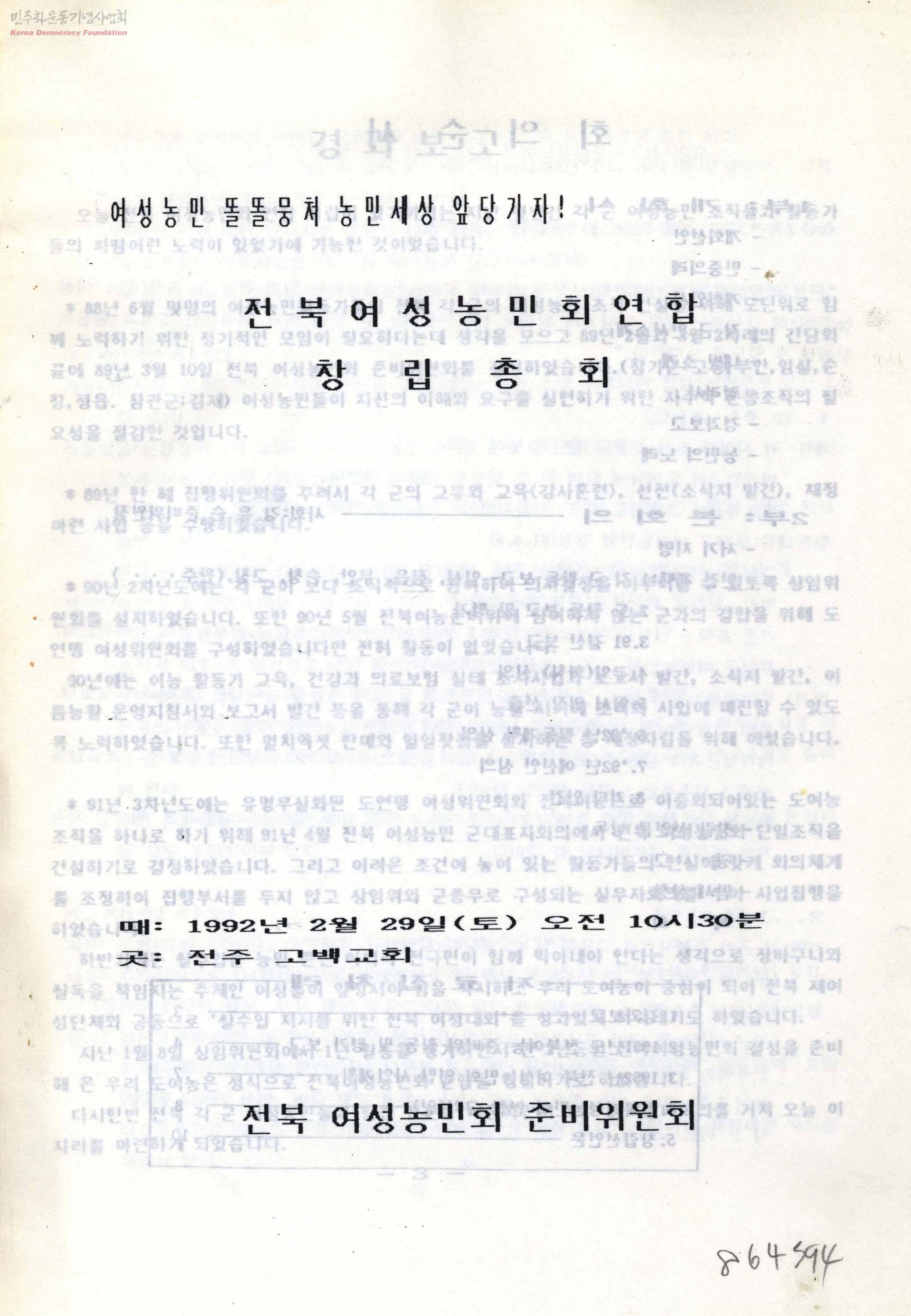 - 여성농민의 생존권 보장과 자주, 민주, 통일을 위해 수입개방 저지투쟁 등의 활동을 지원하고, 자주적 여성농민조직을 건설하는 목적으로 탄생된 전북여성농민회연합 창립총회. 자료집 차례-1. 경과보고, 2. 1991년도 전북여농 준비위 활동 및 평가 보고, 3. 1992년 전북 여성농민회 연합 사업계획, 4. 전북여성농민회 연합 규약(안), 5. 창립선언문
