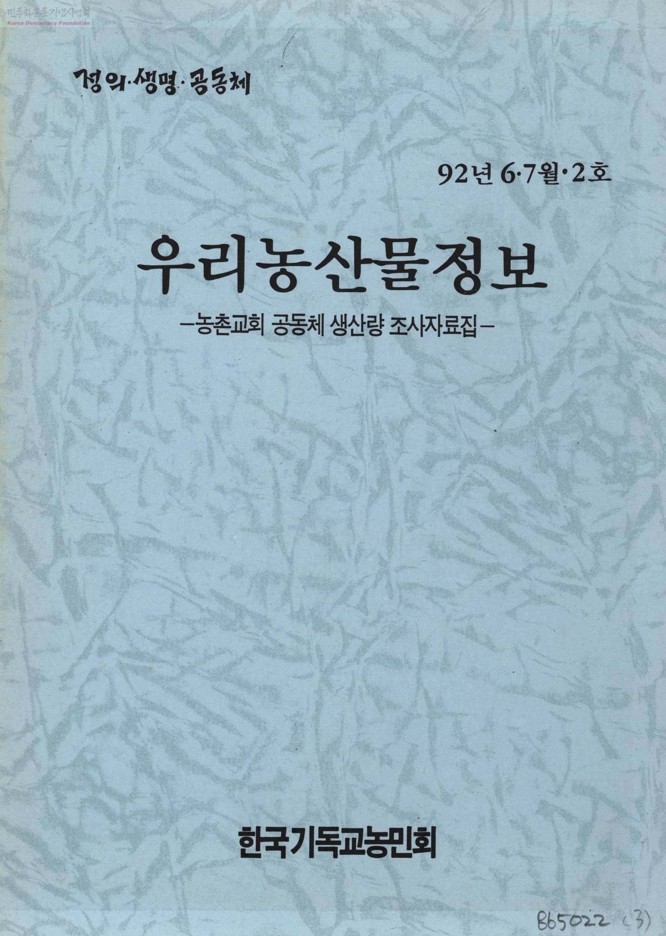 - *한국기독교농민회는 그리스도 복음 아래 농민의 경제·사회·정치적 지위향상을 도모하고, 민족 전통을 이어받은 주체적 농민문화를 창조하여, 민주화와 협동화를 통한 정의롭고 자유로운 사회발전에 기여한다는 창립 목적에 따라 정의운동,생명운동, 공동체운동을 펼치고 있다. -각지의 농촌/교회 공동체의 농산물 생산, 보유 정보를 담은 내용.