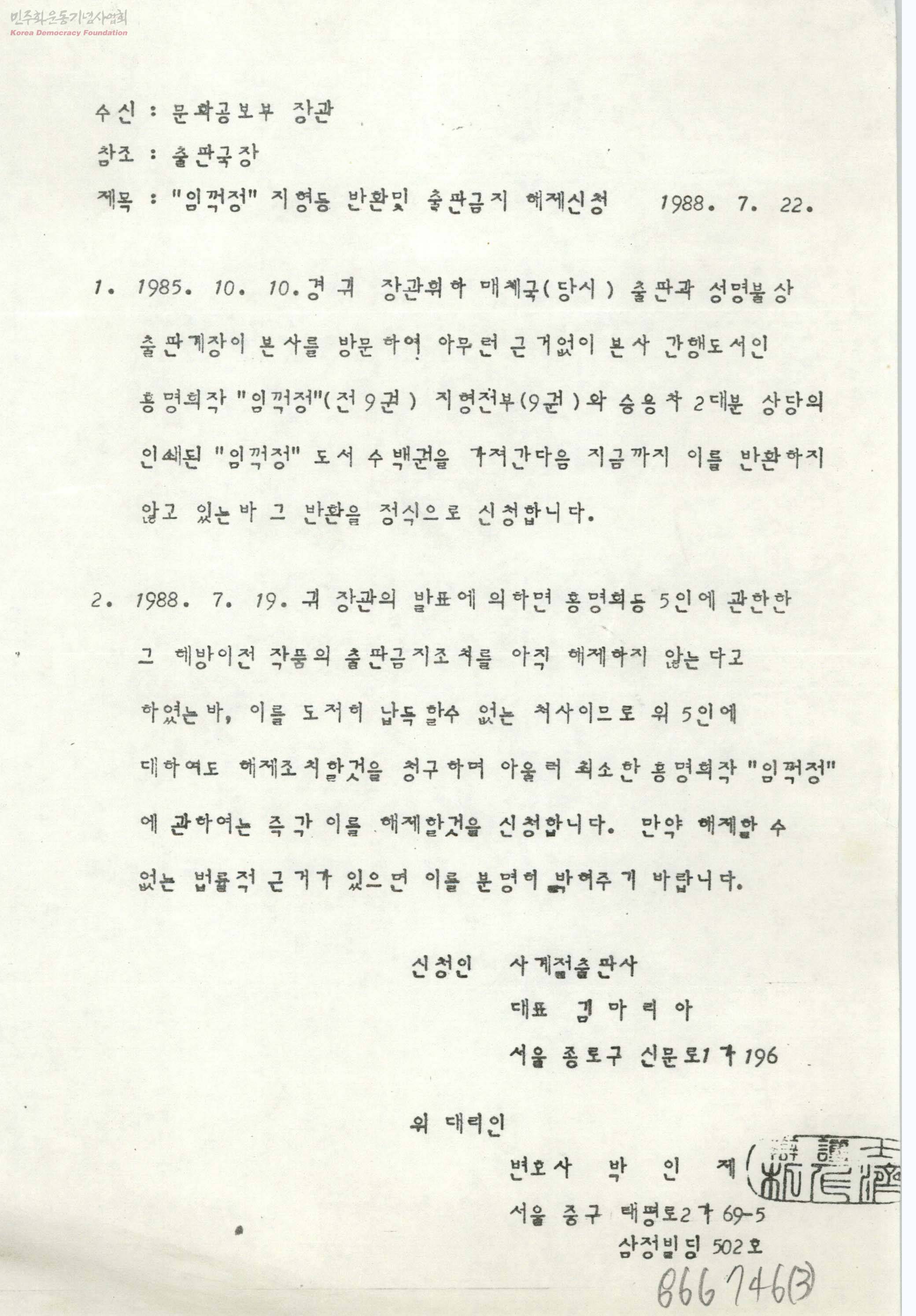 "임꺽정" 지형등 반환및 출판금지 해제신청[수신:문화공보부 장관]