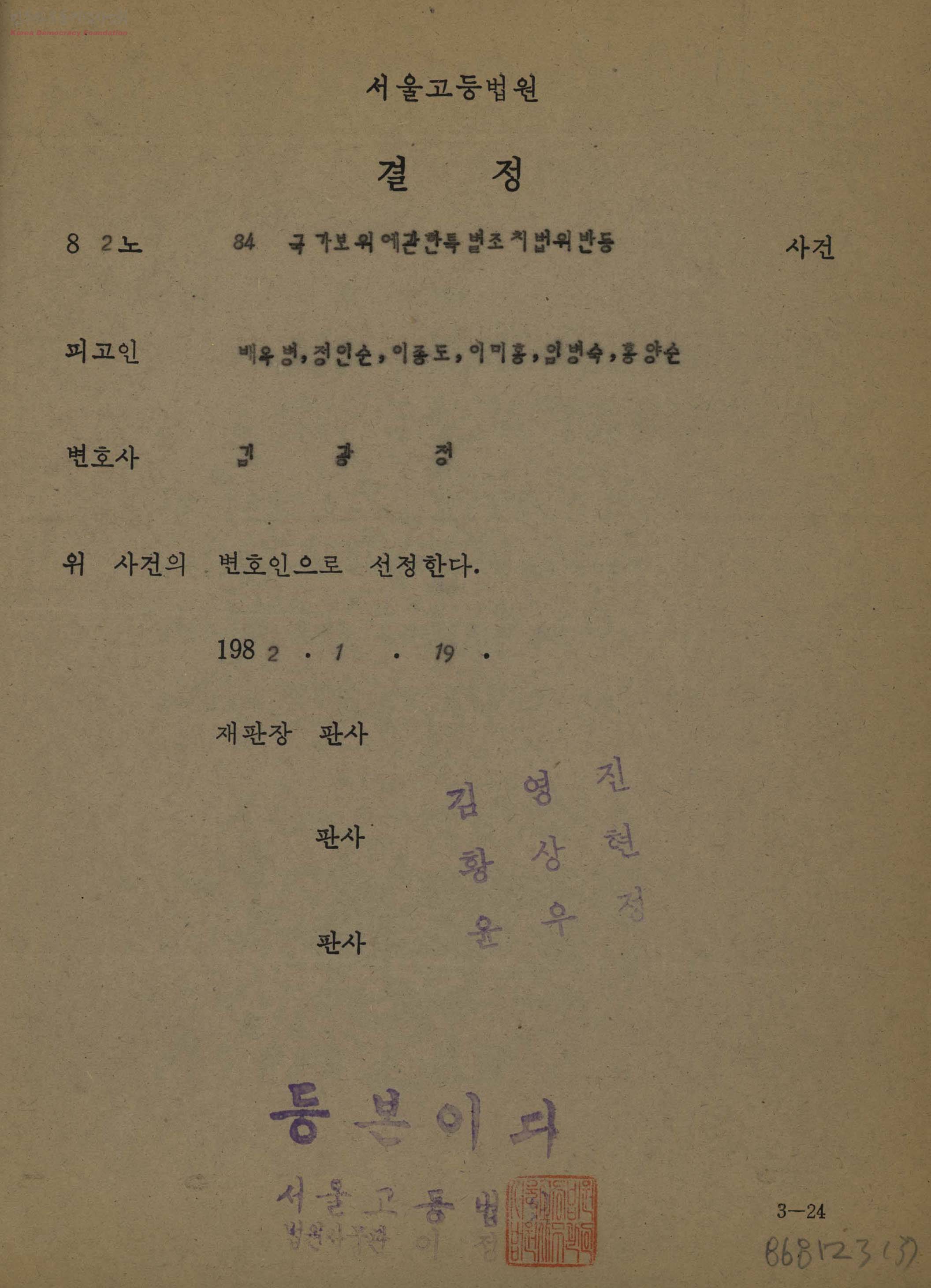 - 서통노조 사건 관련한 항소심에서 피고 배옥병외 5명의 변호인을 김광정으로 선정하고 통지