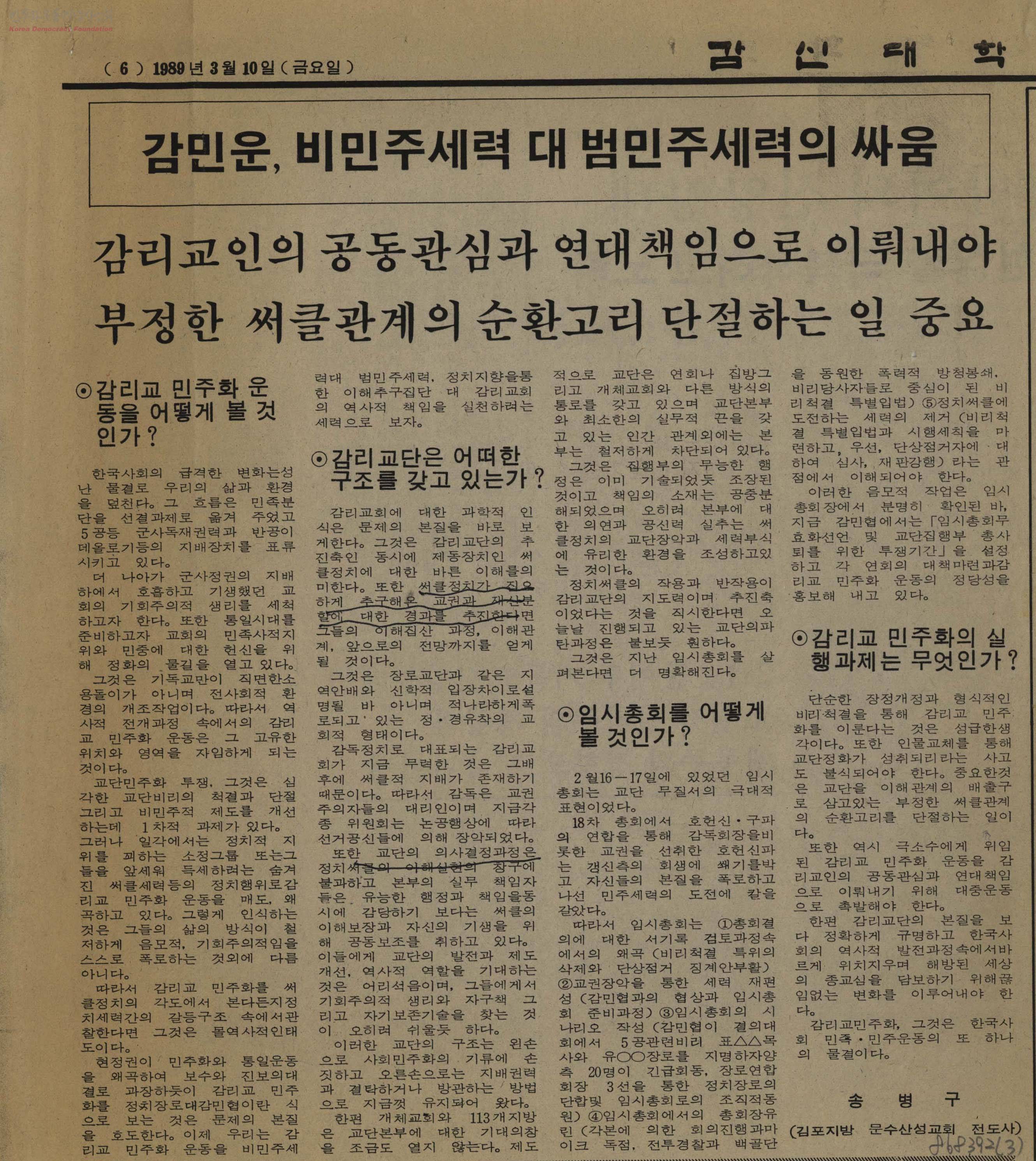 - 군사정권의 지배 하에서 호흡하고 기생했던 교회의 기회주의적 생리를 세척하고자 하는 감리교민주화운동 관련 기사