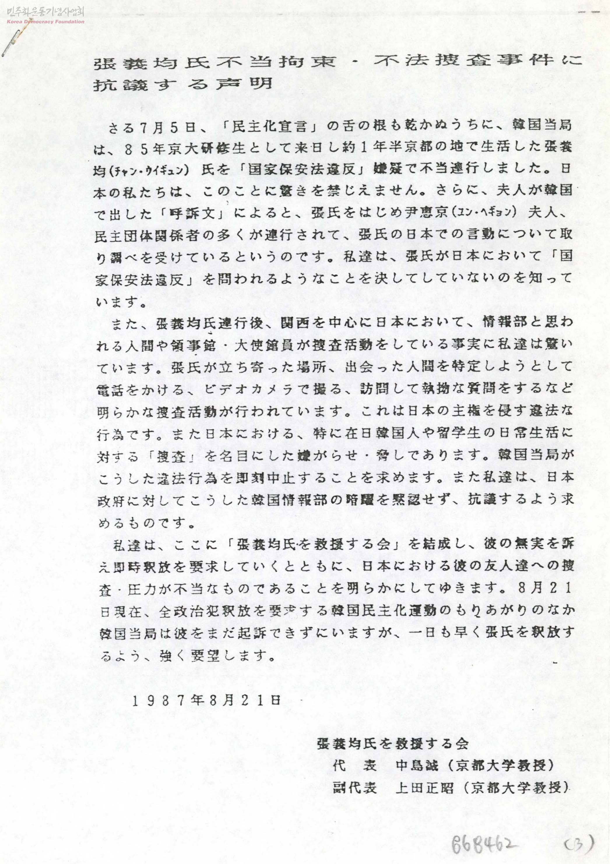 張義均氏不當拘束·不法搜査事件に抗議する聲明