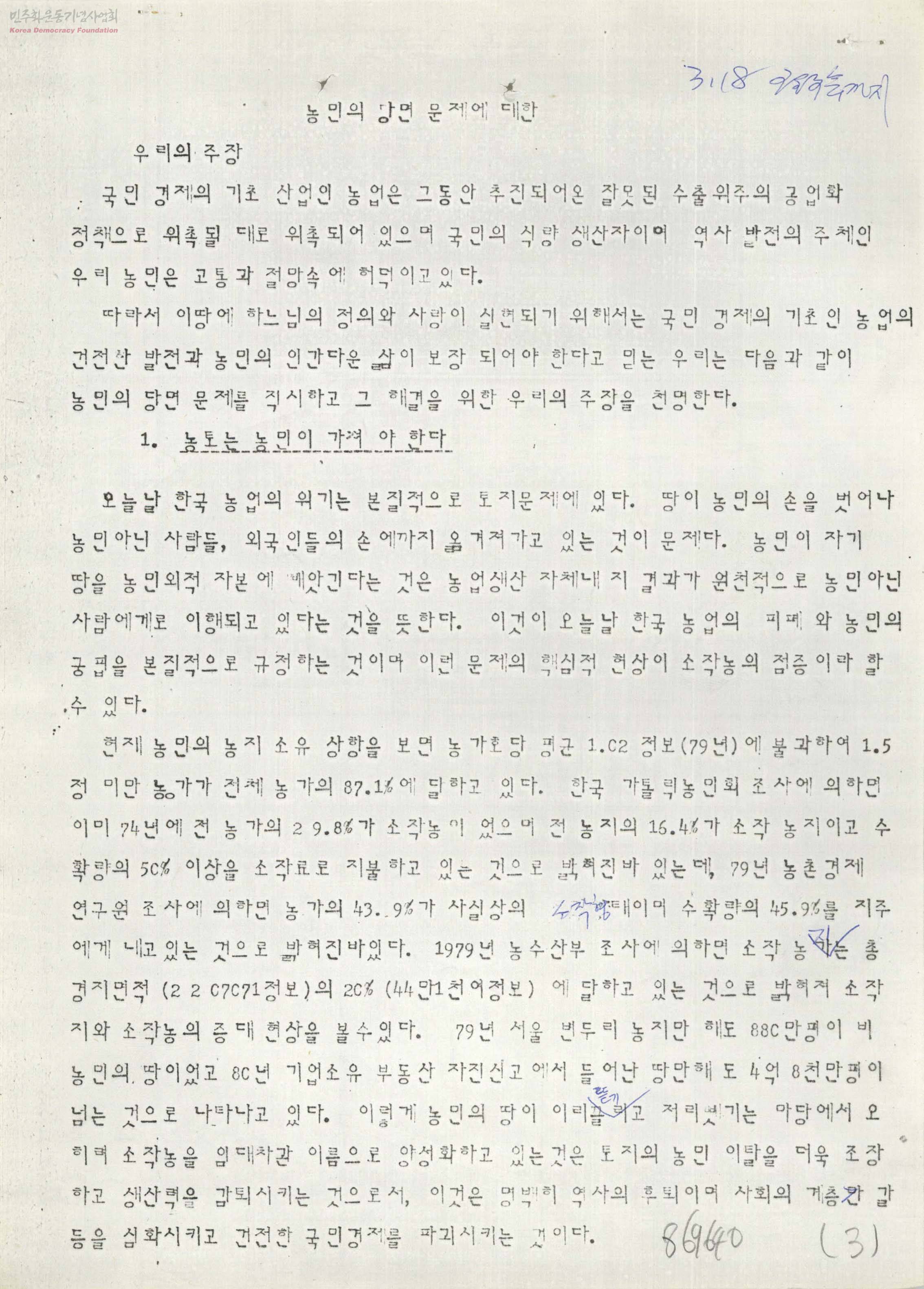 - 전두환 정부의 5공화국에서 내세운 5차 5개년 경제사회개발계획 정책은 농민들을 위해 수정되어야 한다 늘어나는 부채, 외국농산물의 도입과 저농산물가격정책으로 농민은 영농포기와 이농을 강요당하고 있다. 개발계획의 최우선 정책과제로 물가억제 내세우고 농산물값과 임금억제를 더욱 강화하는 것은 농업을 말살시키는 정책이다 등