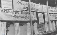 - 6월 항쟁 당시 광주 지역 상황을 알리는 속보 애국민중의 힘으로 헌법과 정부를 쟁취하자! 전두환 군부독재는 지금 즉시 퇴진하라! 등
