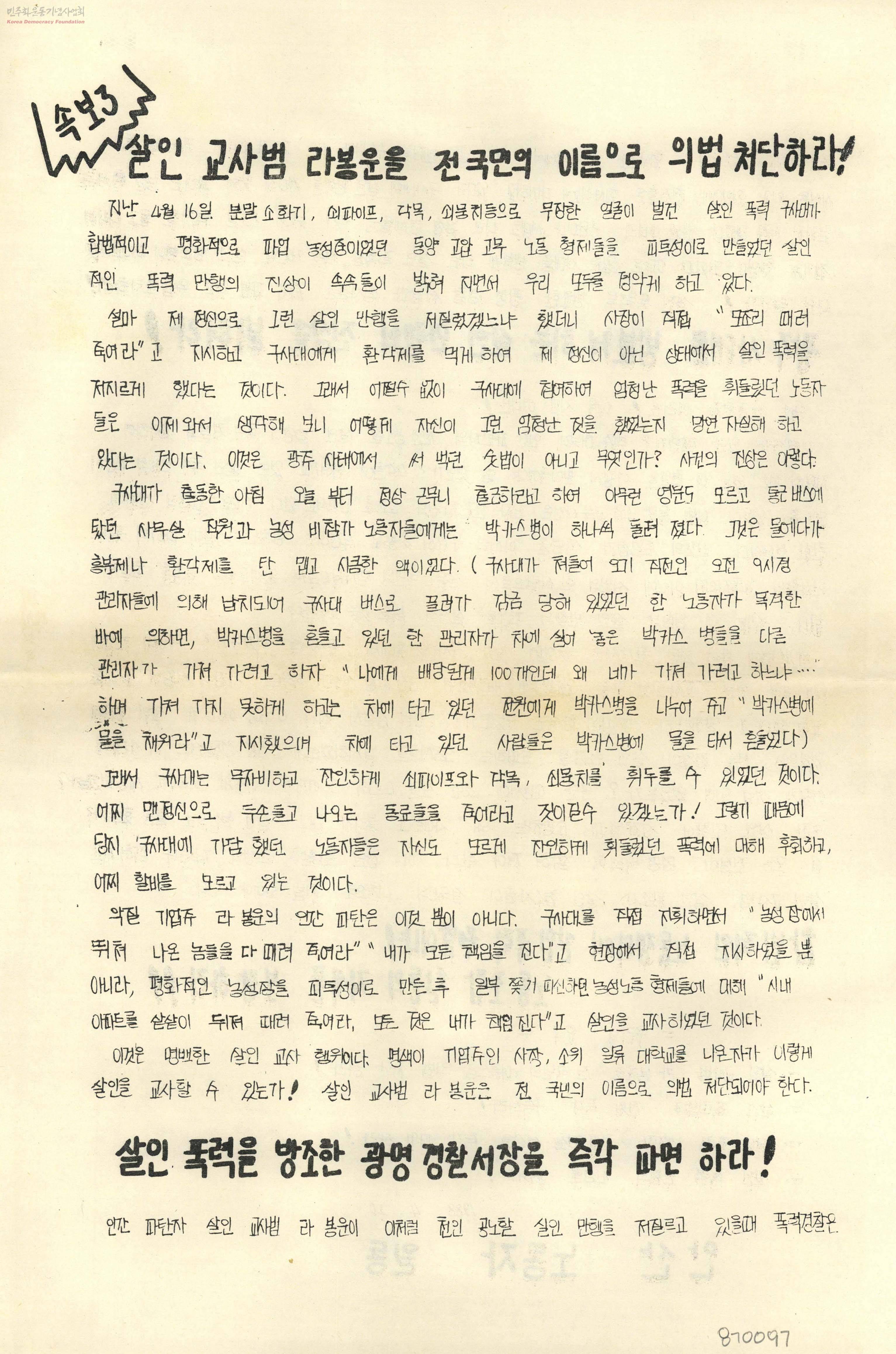 - 살인 교사범 라봉운을 전 국민의 이름으로 의법 처단하라! 살인 폭력범을 전원 즉각 구속하라! 살인 폭력을 방조한 광명경찰서장을 즉각 파면하라! 광주사태를 방불케 하는 살인 만행의 진상을 밝혀라!