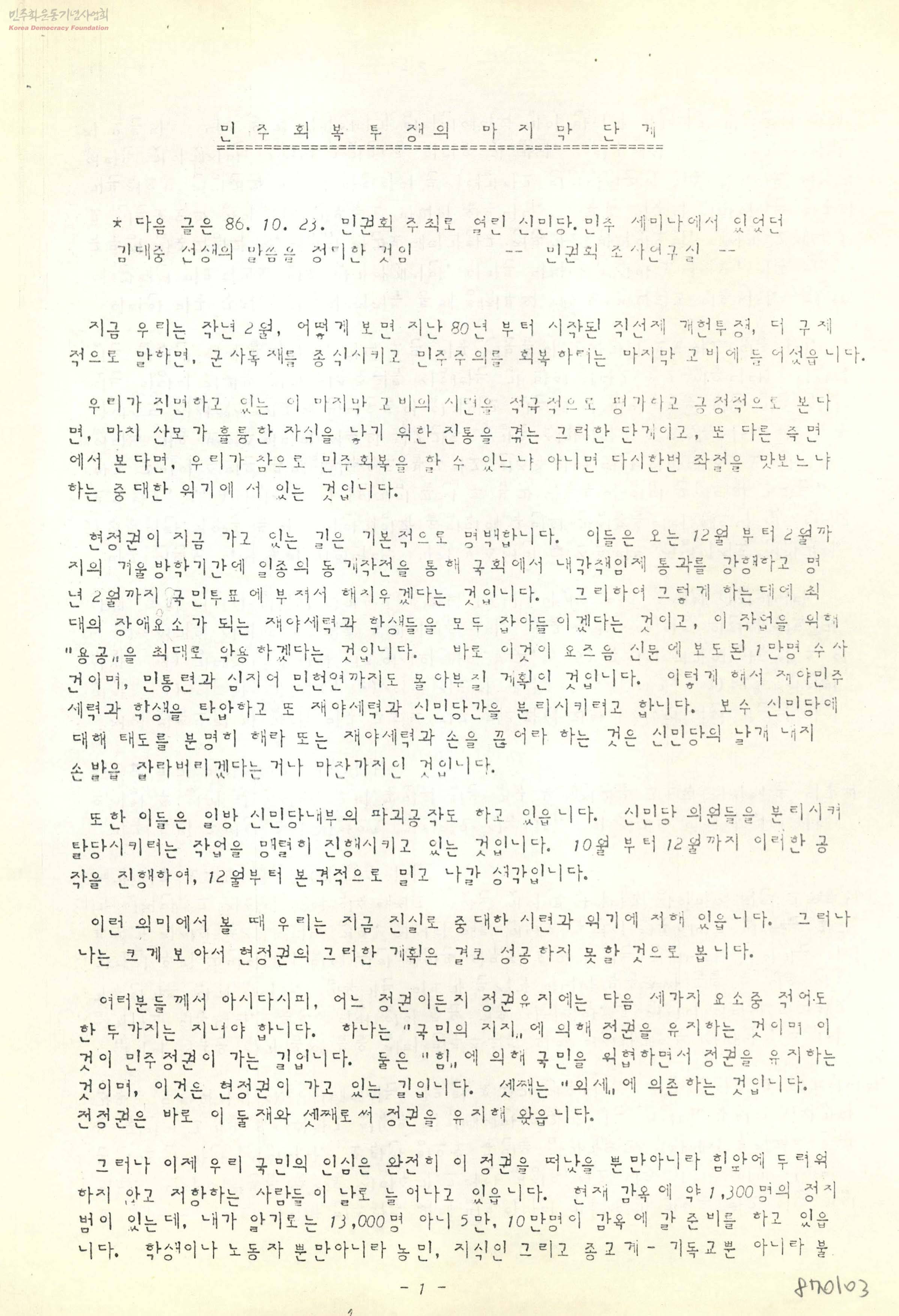 - 민권회 주최로 열린 신민당, 민주 세미나에서 있었던 김대중 선생의 말씀을 정리한 것.