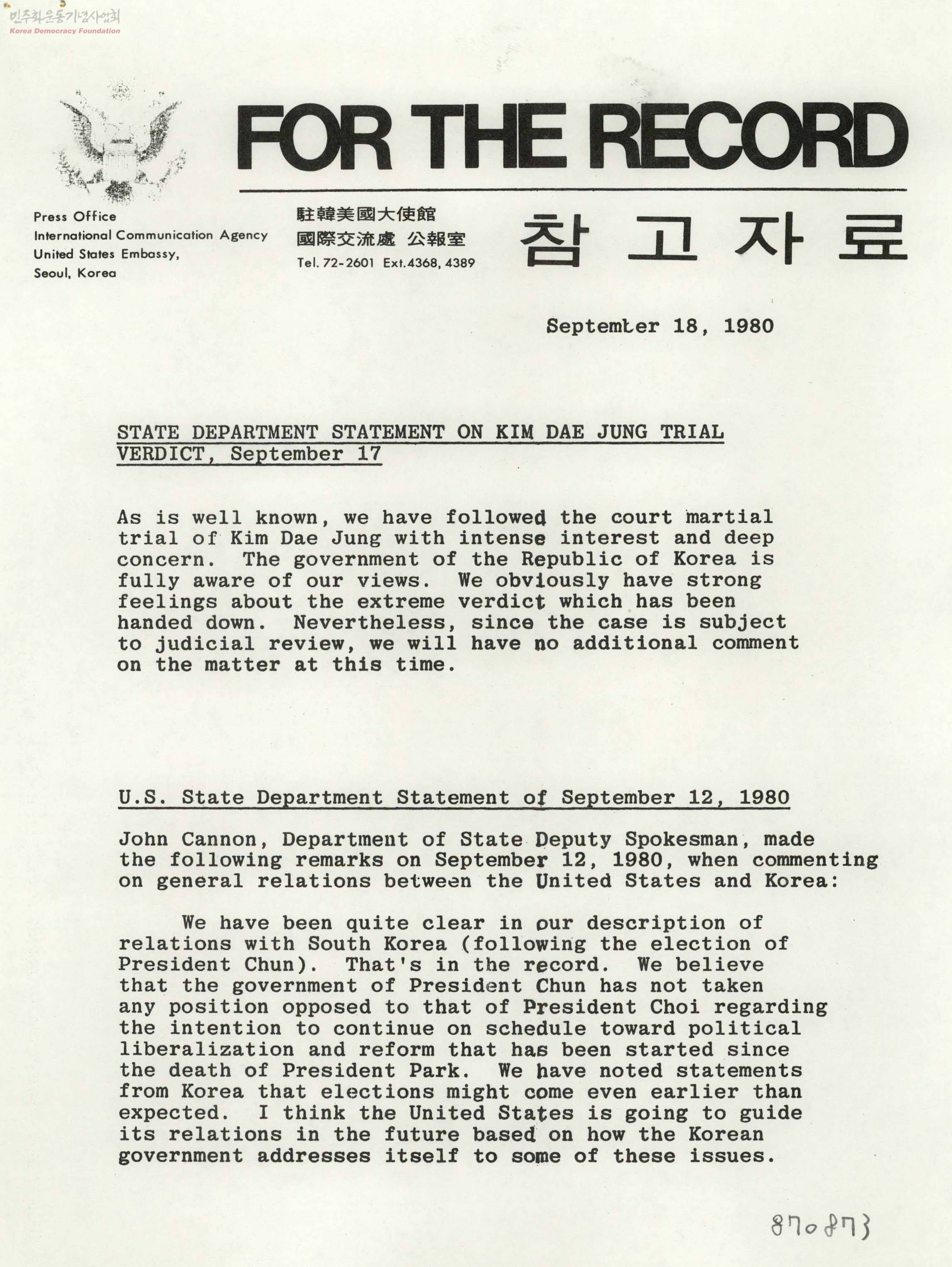 FOR THE RECORD[STATE DEPARTMENT STATEMENT ON KIM DAE JUNG TRIAL VERDICT, September 17]