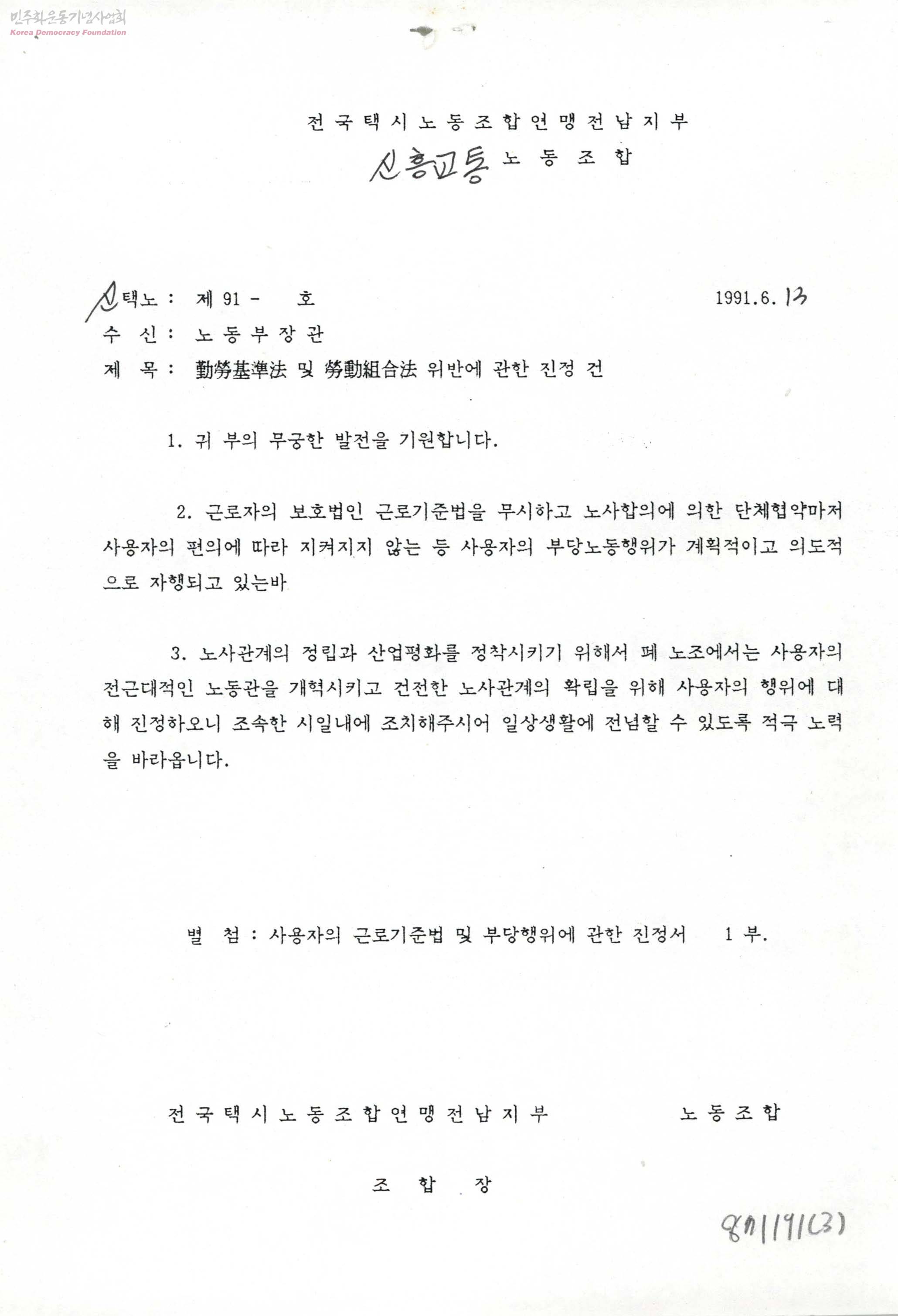 근로기준법 및 노동조합법 위반에 관한 진정 건[수신:노동부장관]