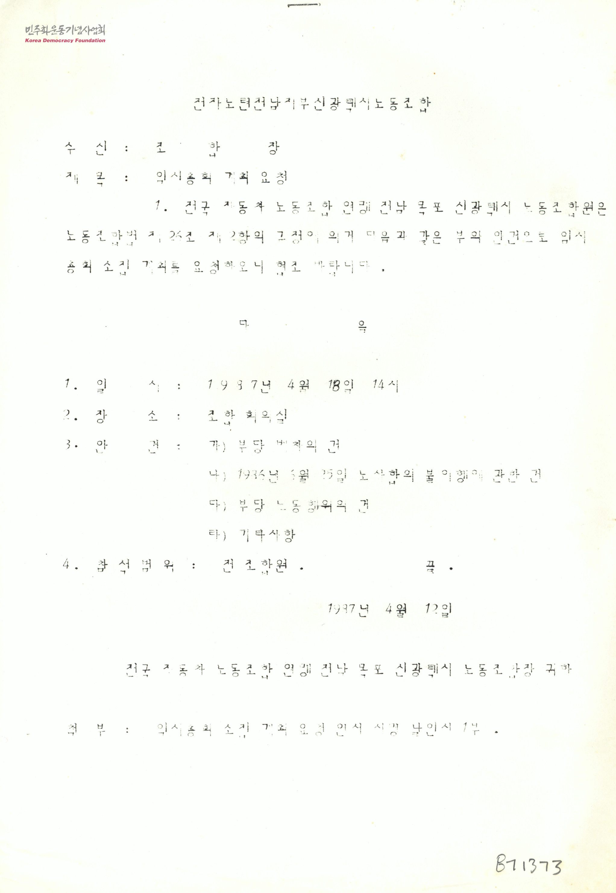 - 87노동자 대투쟁 이후에도 바로잡히지 못한 노동자임금, 기본권 쟁취 문제, 해고자 문제등에 관해 기업별 노조의 한계를 극복하고 권익을 지키고자 한 전국자동차 노동조합연맹 신광택시노동조합의 총회개최 요청.