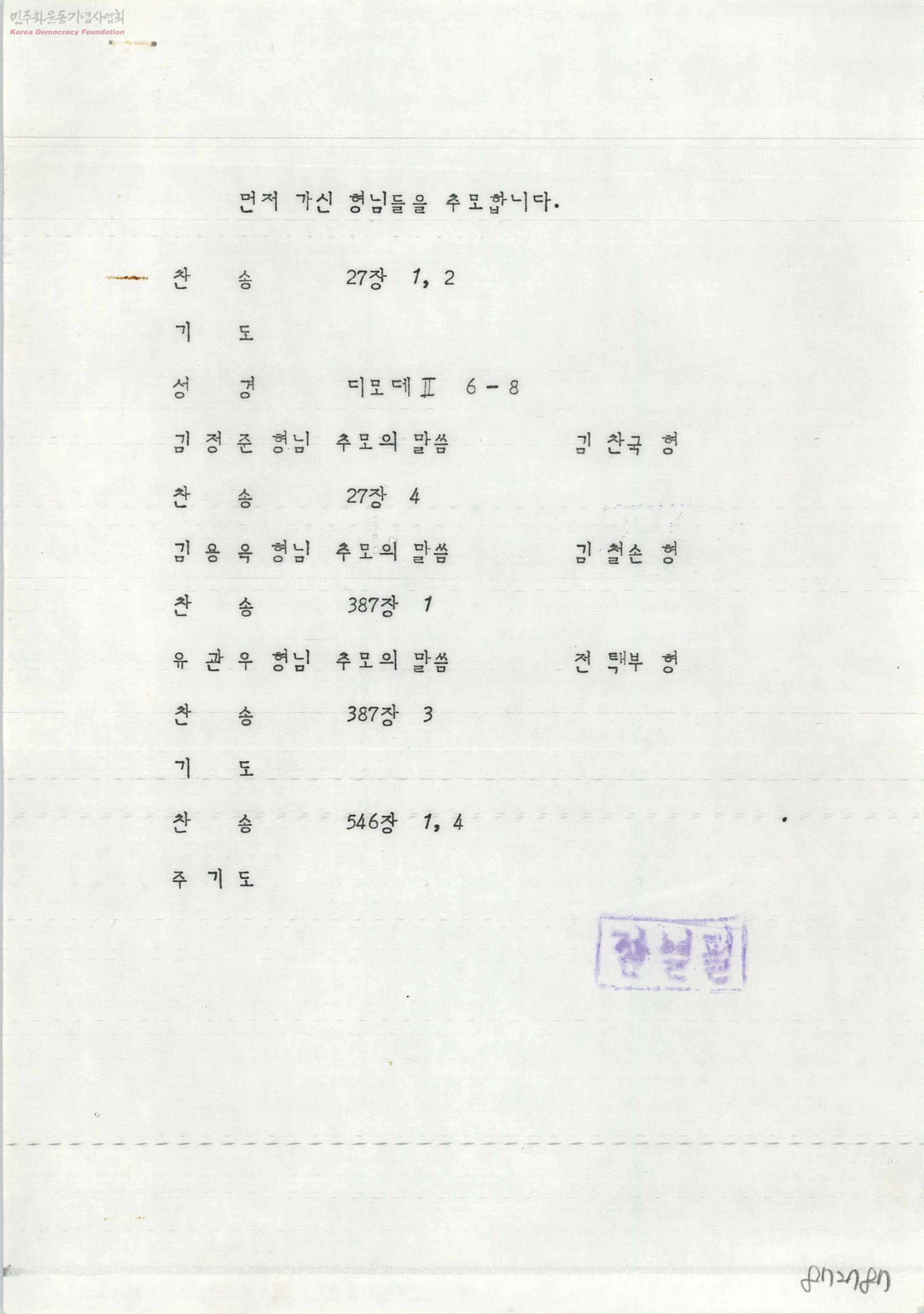 - 감옥에 수감중인 문익환 목사에게 보낸 신학자 김정준, 김용옥, 유관우의 추모예배순서지