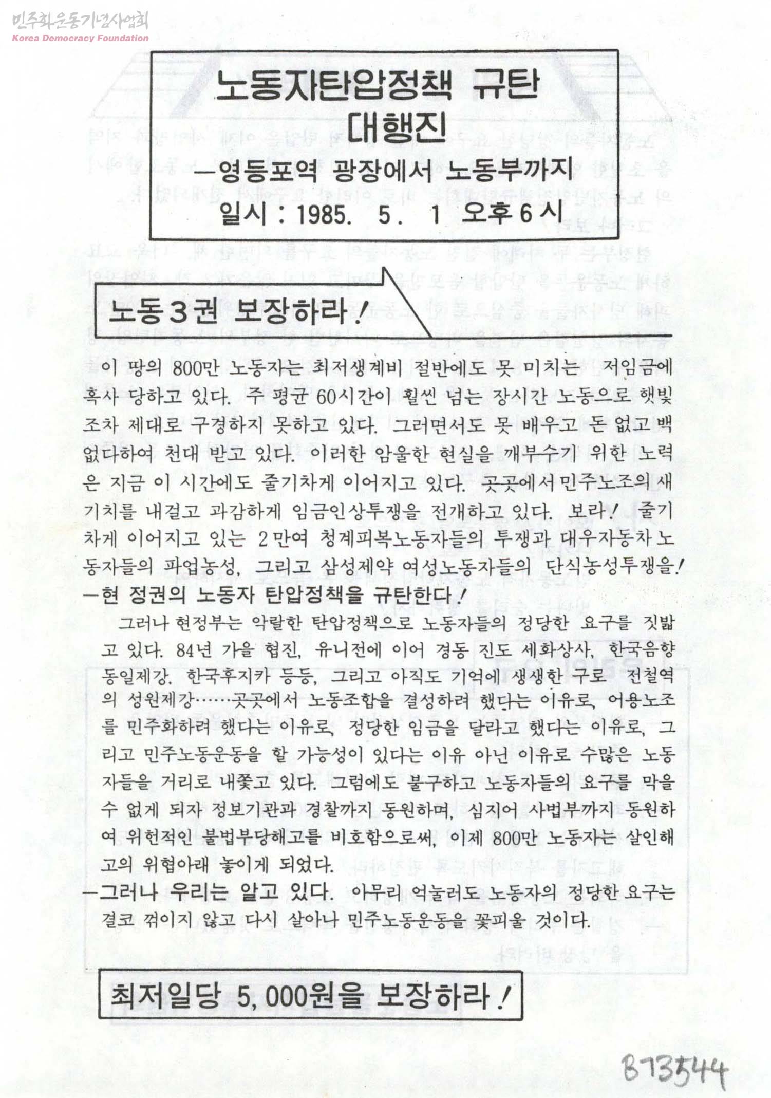 - 청계피복노동자, 대우자동차 노동자들의 파업농성, 삼성제약 여성노동자들의 단식농성투쟁 소식과 민주노조 건설과 정당한 임금인상을 요구한 노동자들에 대한 정부의 탄압을 알리고, 85년 5월 1일, 노동자탄압정책에 대한 규탄 대행진 행사에 참여할 것을 호소. 노동운동 탄압 중단과 최저임금제 실시 및 최저일당 5,000원을 보장할 것을 요구.