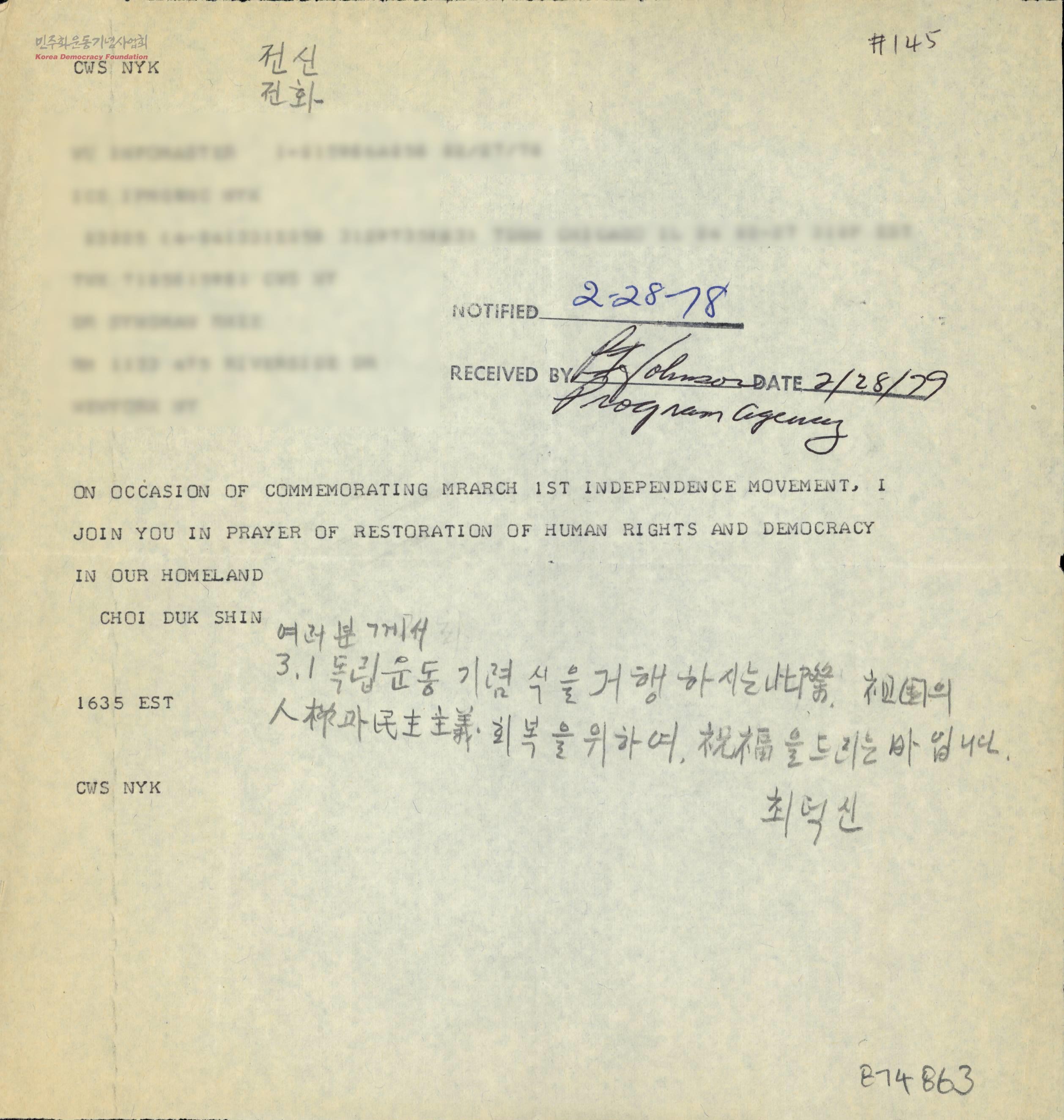 [최덕신이 보낸 팩스 문서]