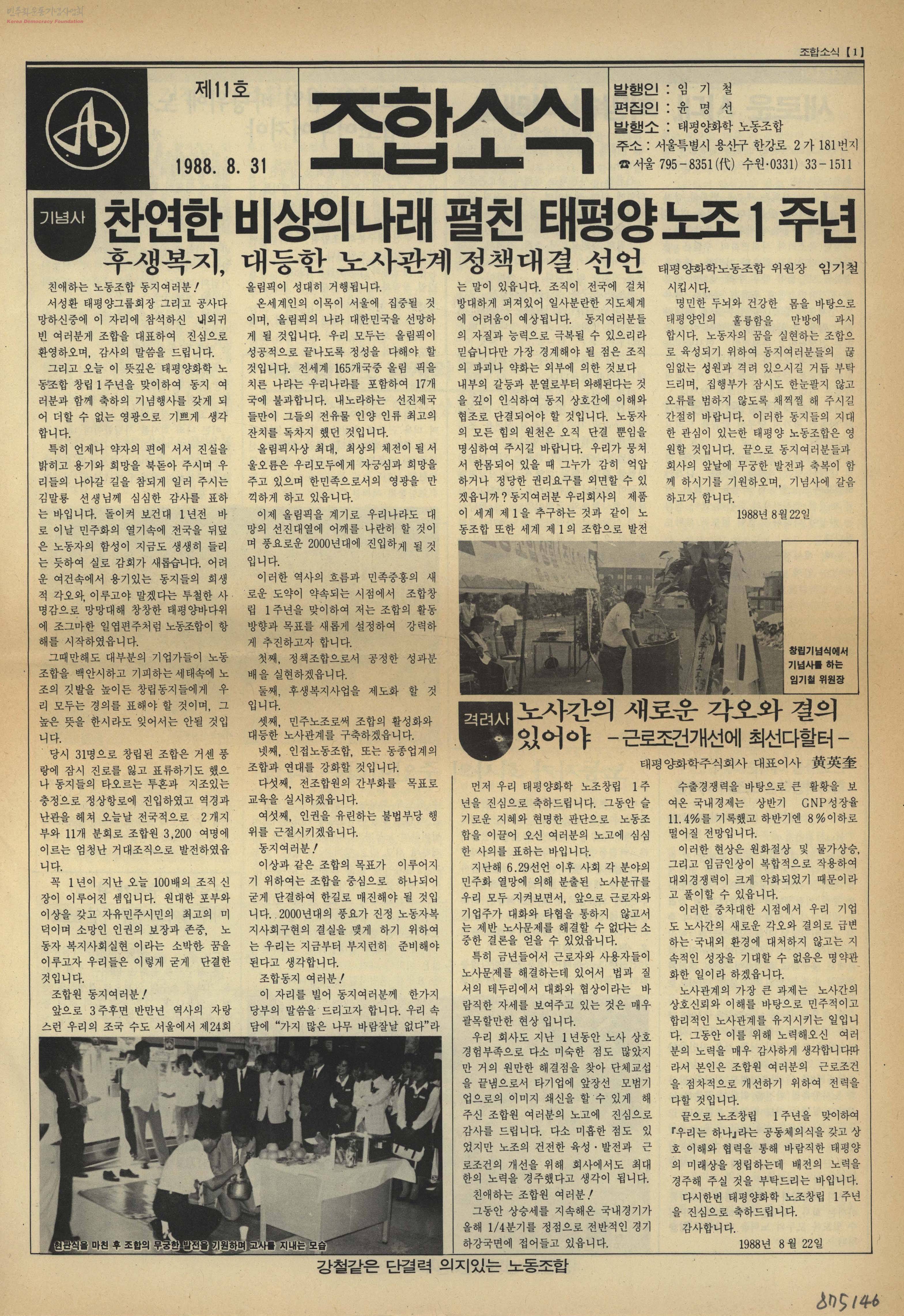 - 임기철위원장의 노조 창립 1주년 기념사와 결의문 등이 실려있음.