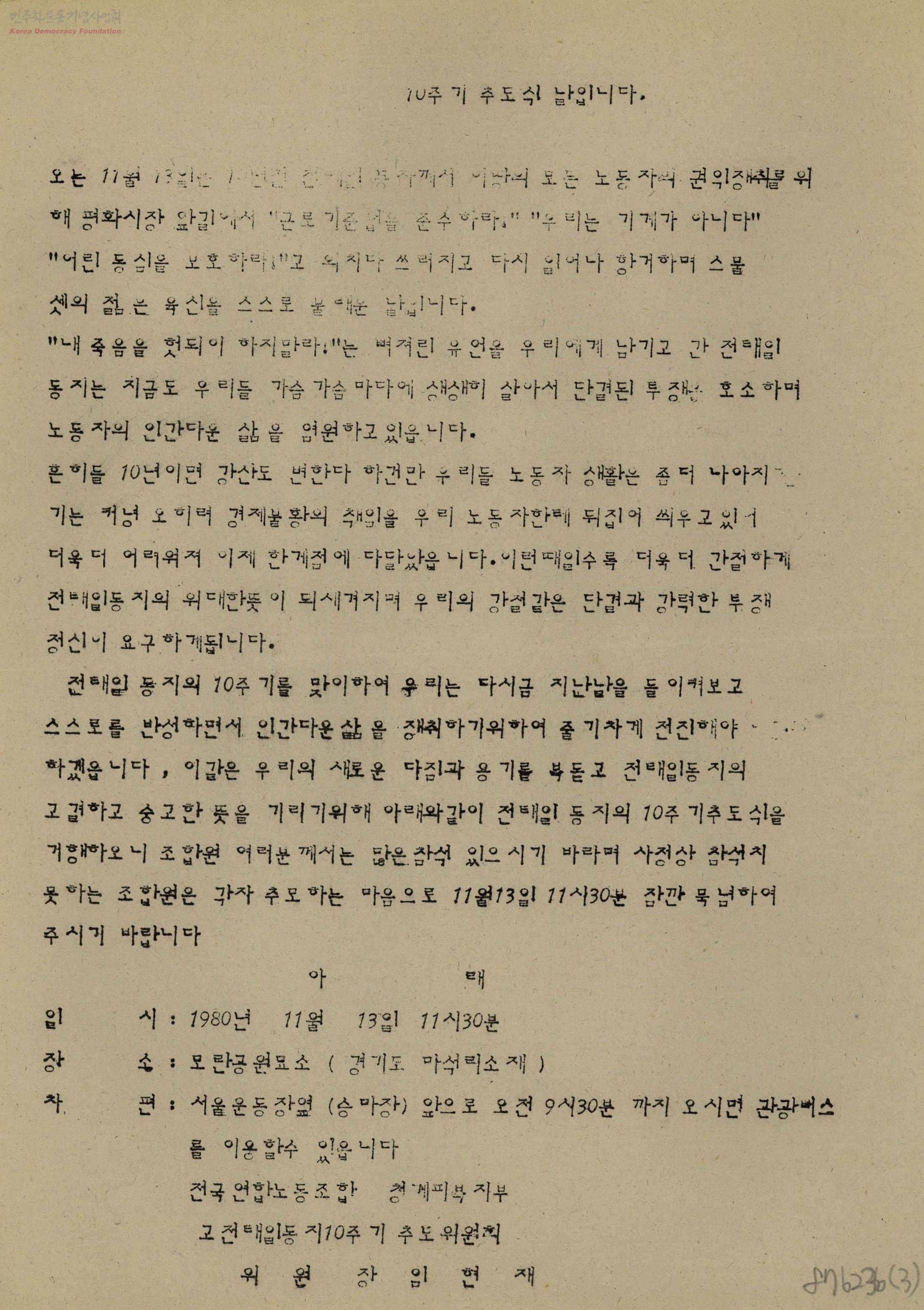 - 70년대 유신체제하에서 노동운동과 노동자에 대한 탄압 속에서 노동자의 권익쟁취를 위해 죽음으로 항거한 전태일열사의 10주기 추도식에 대한 안내문