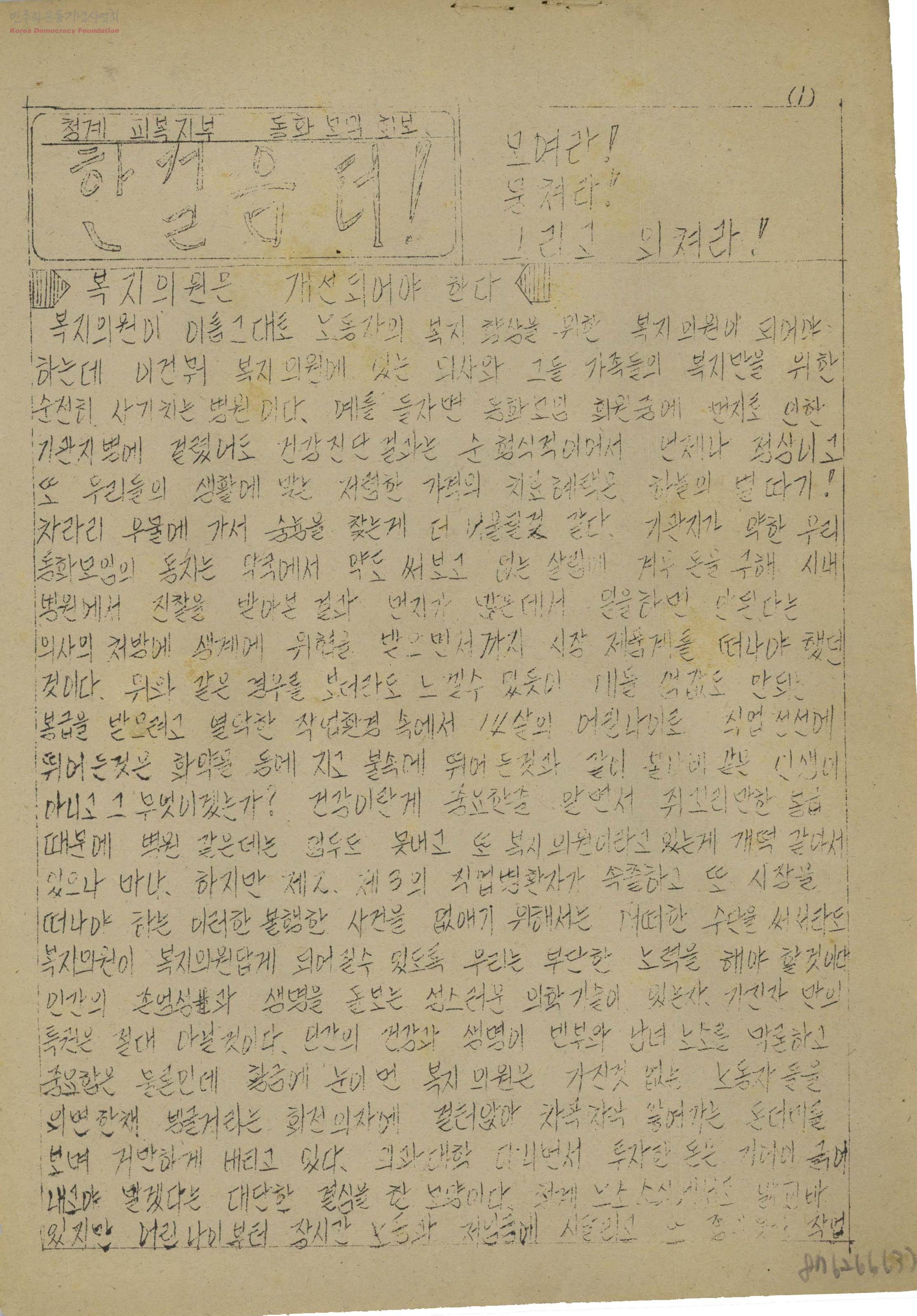 - 70년대 박정희 유신체제하에서 개정된 노동운동법으로 인해 노동조합운동에 대한 규제가 강화되었으나 노동자들이 자신들의 권리와 생계권을 위해 조직적인 투쟁을 전개해나감. 청계피복노동조합 산하의 동화모임에서 노동자에 대한 복지개선과 처우에 대한 지적과 동화모임 소식 등.
