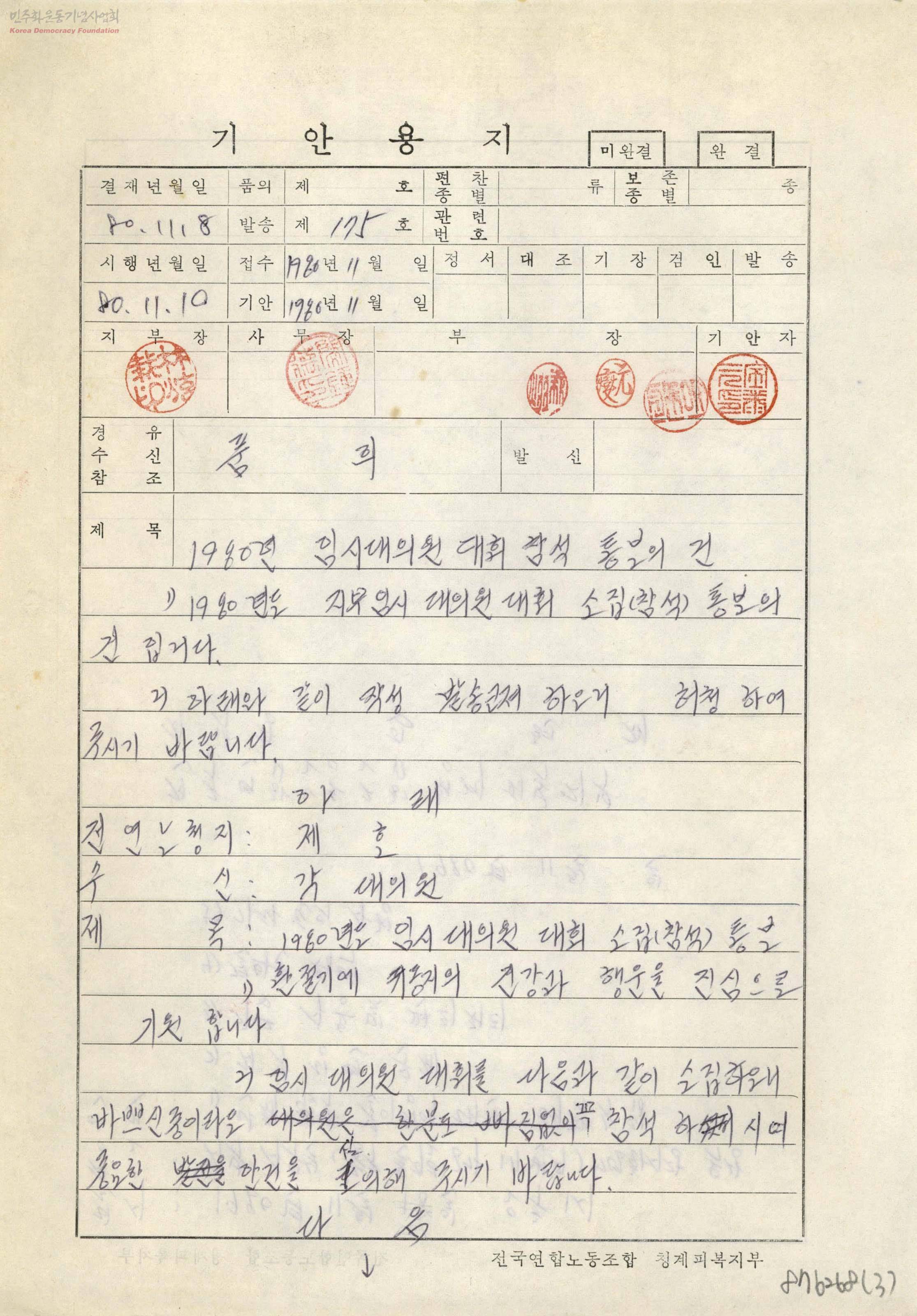 1980년 임시대의원대회 참석 통보의 건