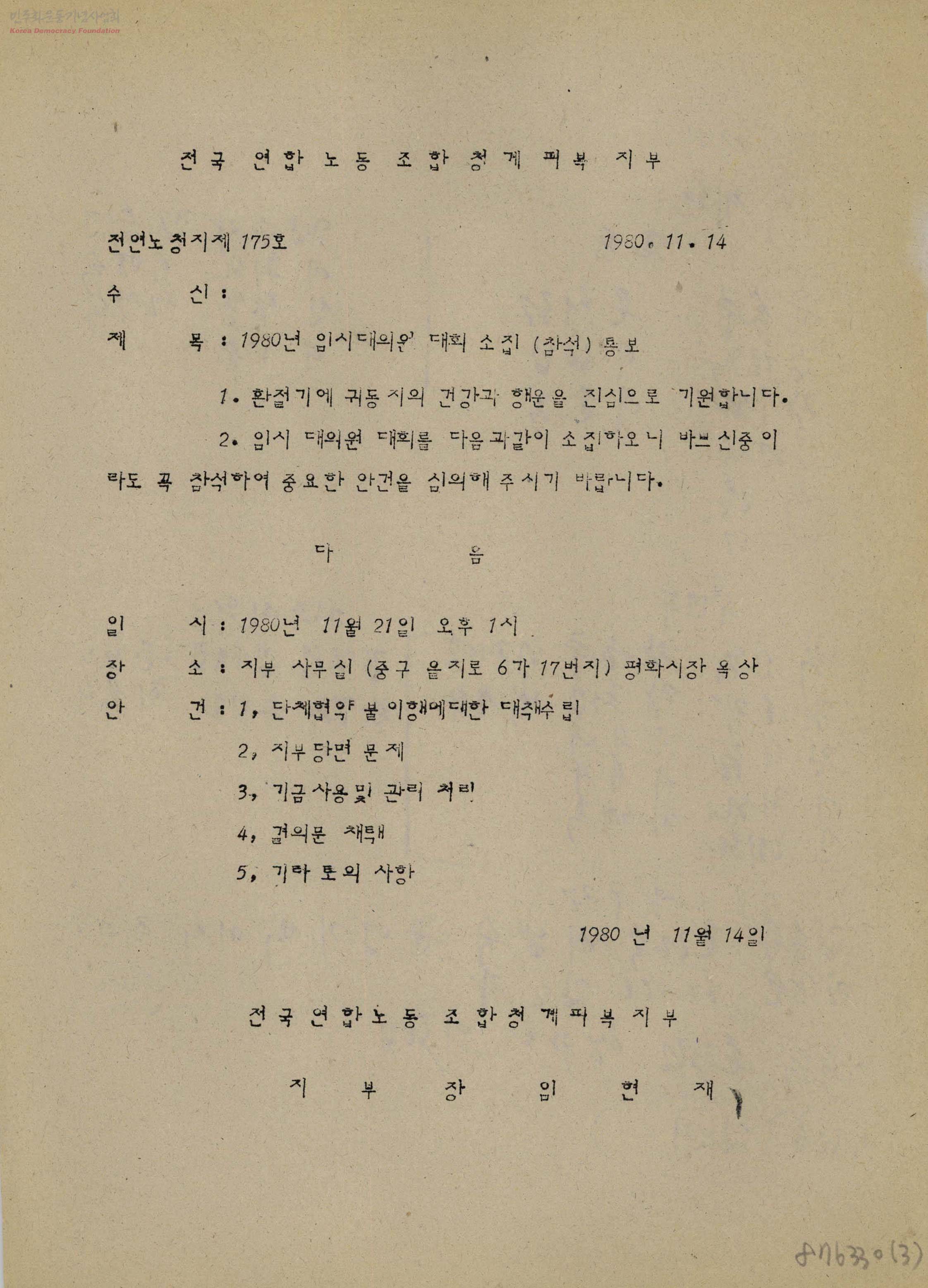 - 70년대 박정희 유신체제하에서 개정된 노동운동법으로 인해 노동조합운동에 대한 규제가 강화되었으나 노동자들이 자신들의 권리와 생계권을 위해 조직적인 투쟁을 전개해나감. 이는 80년대 전두환정부가 들어선 이후에도 계속되었으며 전태일열사의 분신이후 특히 청계피복노동자합의 활동이 활발했다. 노사협의회에서 결정된 단체협약을 사용자측이 불이행한데 대한 대책수립과 기금사용, 결의문 채택등과 같은 안건으로 대의원회 소집 공문 발송.
