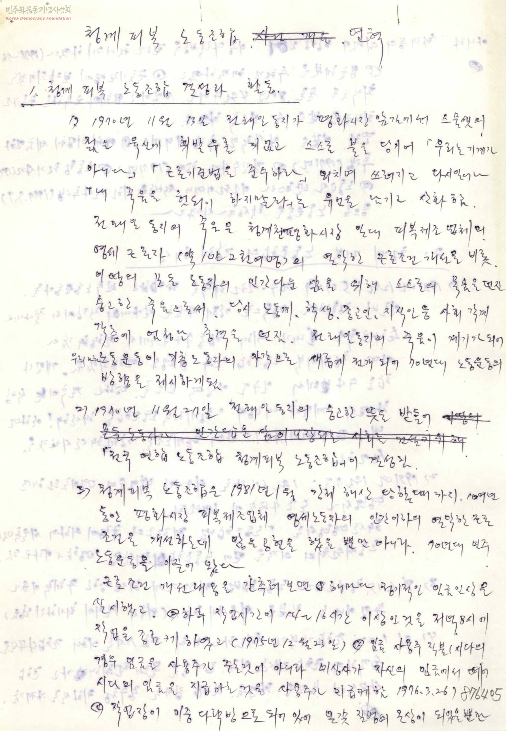 - 1970년 열악한 노동환경 개선과 노동자의 권리를 위해 분신한 전태일 열사의 유지를 이어받아 결성된 청계피복노동조합 결성과 활동, 강제해산, 복구를 위한 활동 등에 관한 내용.