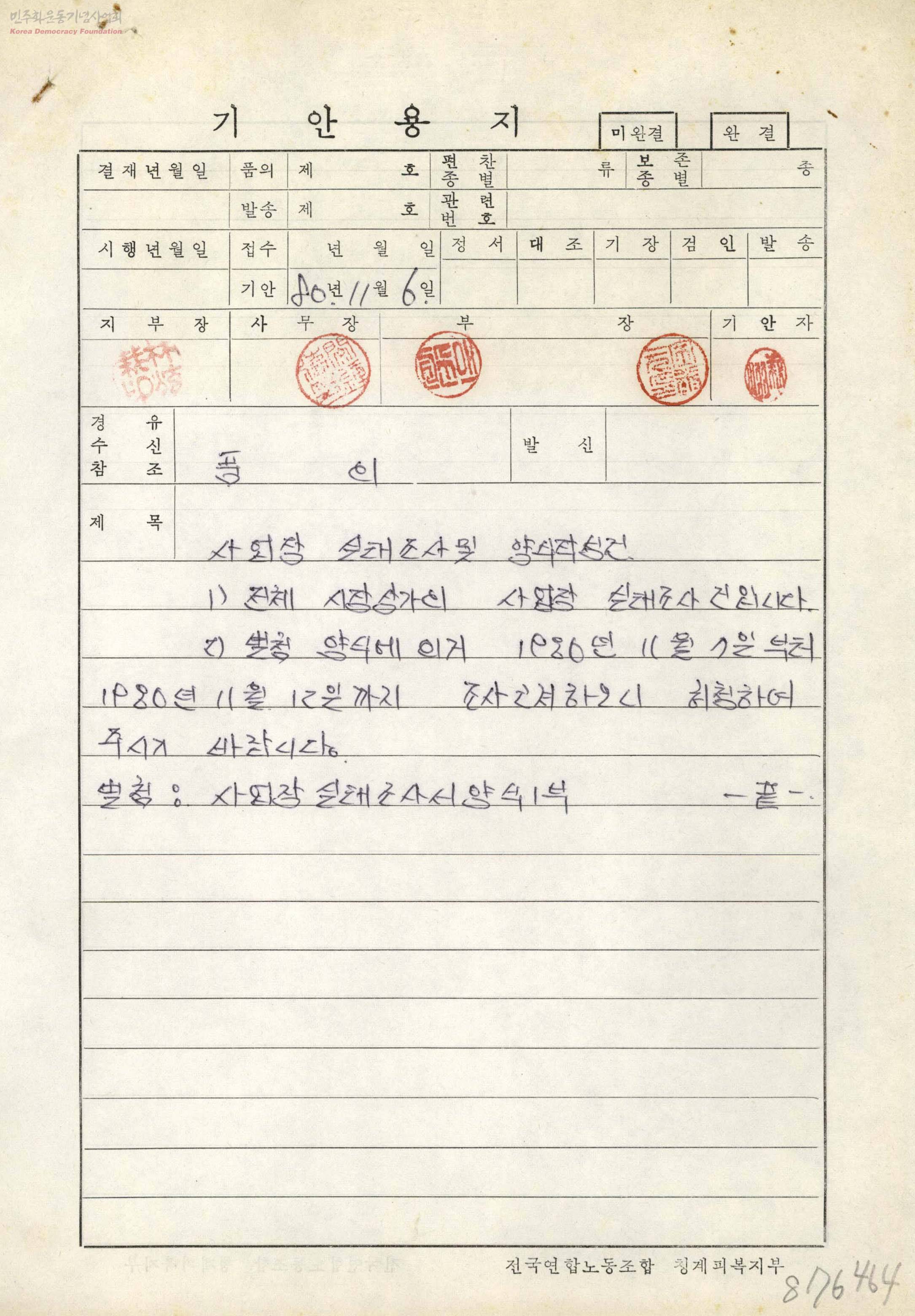 - 1970년 열악한 노동조건 개선을 위해 분신한 전태일 열사의 유지를 이어받아 결성된 청계피복노조 작성 전체 시장상가의 사업장 실태조사의 건이며 사업장 실태조사서 양식1부 첨부