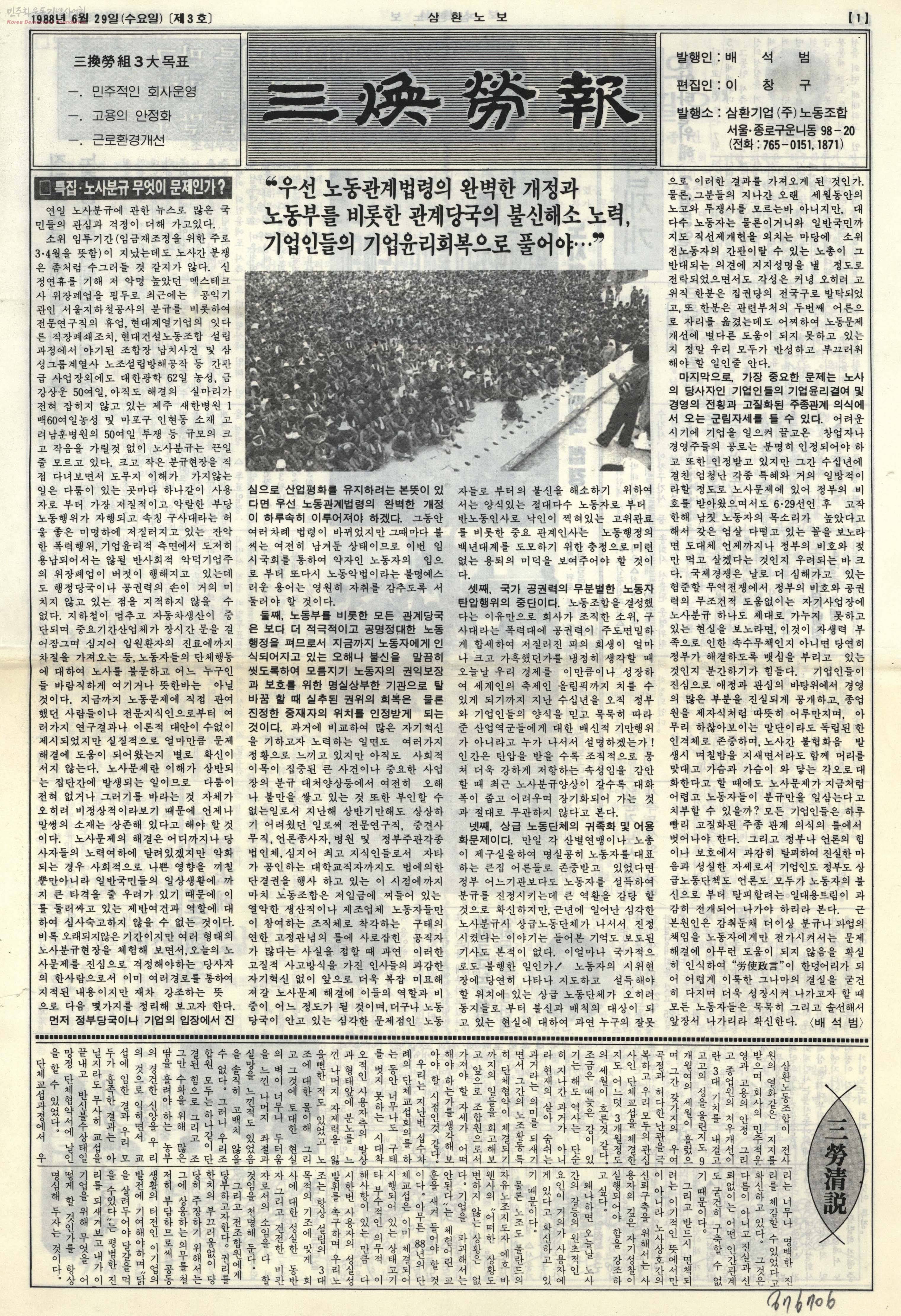 - 87노동자 대투쟁 이후 영향을 받아 노동자임금, 기본권 쟁취 문제, 해고자 문제등에 관해 권익을 지키고자 삼환기업노동조합에서 발행한 소식지. 특집·노사분규 무엇이 문제인가?-우선 노동관계법령의 완벽한 개정과 노동부를 비롯한 관계당국의 불신해소 노력, 기업인들의 기업윤리회복으로 풀어야 부당노동행위 고법에 제소 노조전임을 하면서 노조활동에 적극 동참을 등 기사 수록