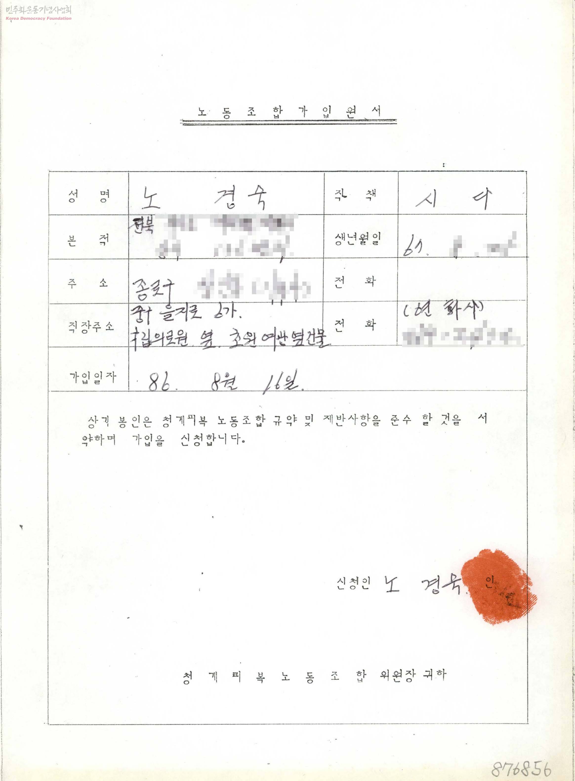 - 노경숙, 김인자, 임미란의 청계피복노조 가입 신청서