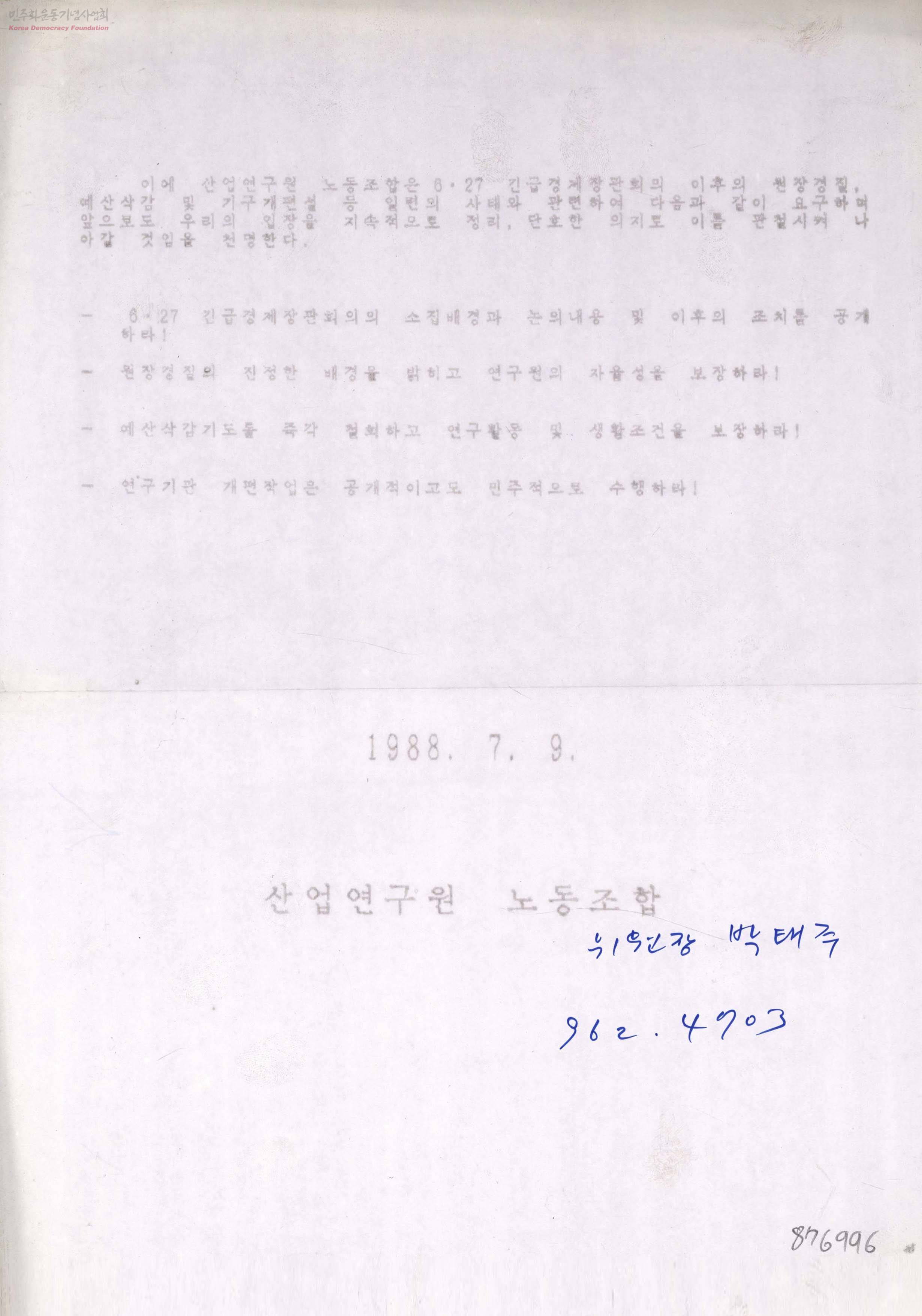 - 8.27 긴급경제장관회의의 소집배경과 논의내용 및 이후의 조치에 대한 공개와 원장경질에 대한 배경공개와 연구원 자율성 보장 촉구