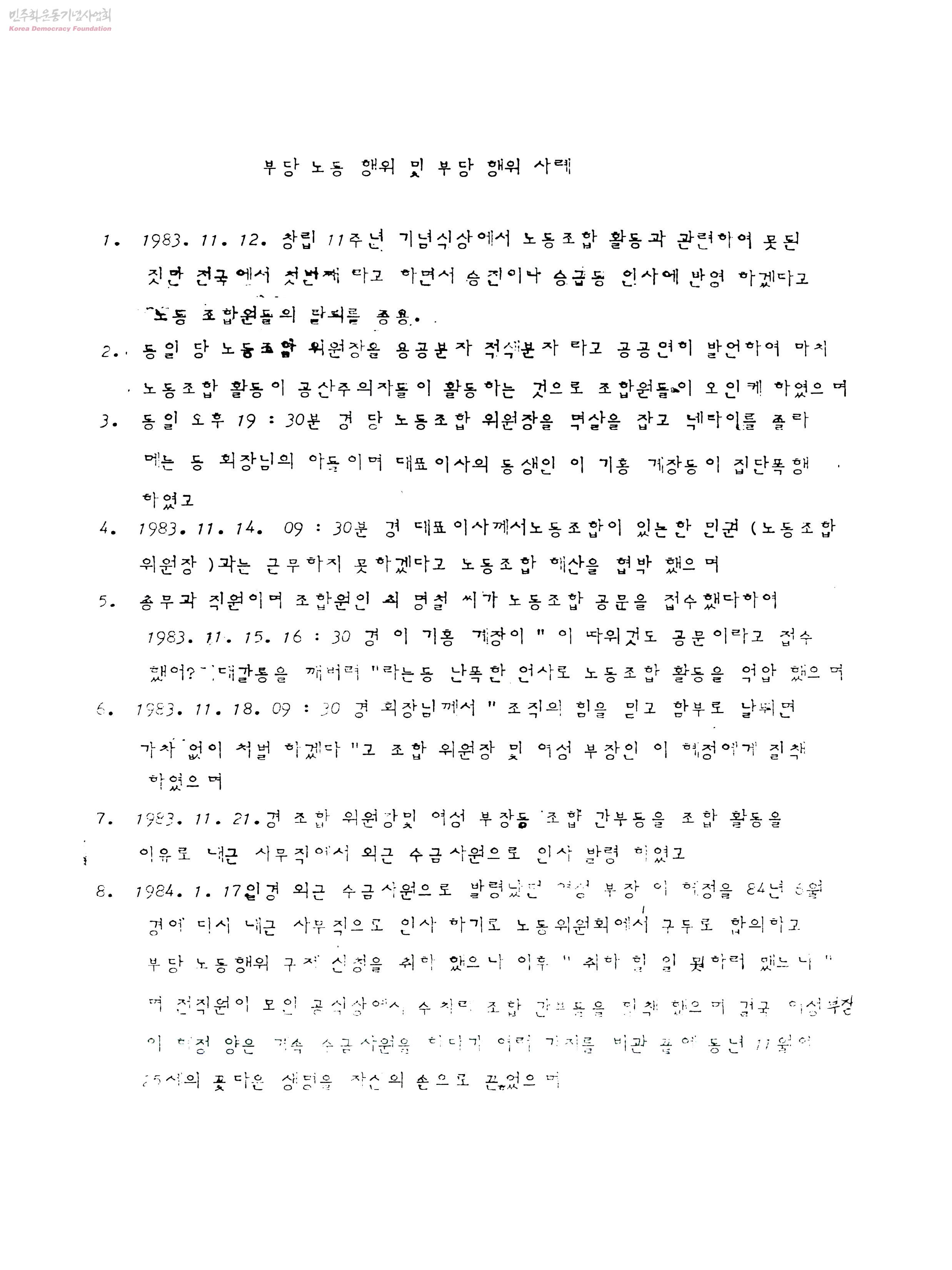 - 조합원에 대해 부당한 발령을 하여 조합원이 자살하는 사태가 벌어지는 등 사측의 노조탄압 사례를 담은 대한상호신용금고노조의 유인물