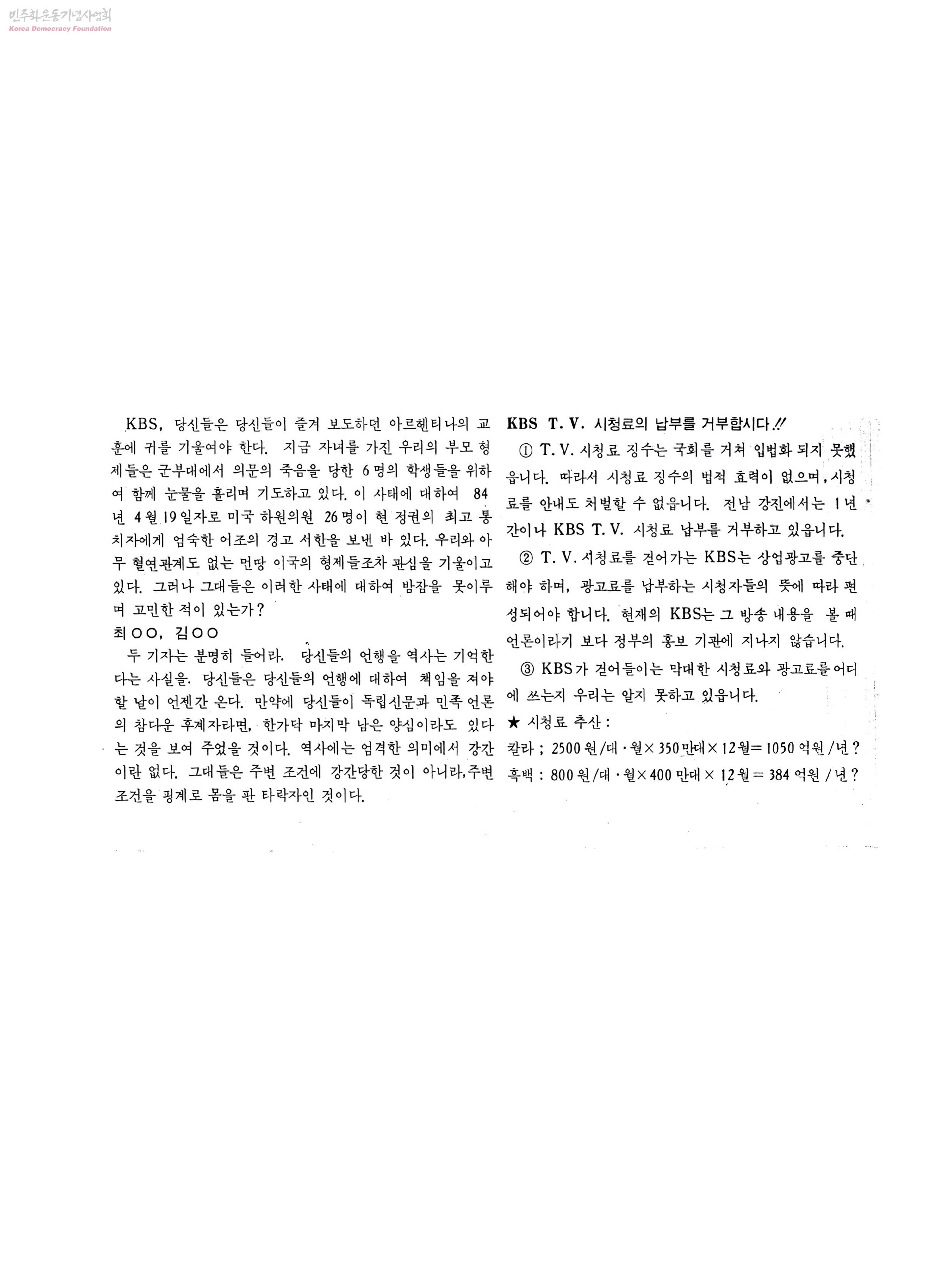 - 80년대 어용화된 KBS 공영방송의 문제점을 비판하고, 시민들의 행동을 통해 권력과 자본으로부터 독립된 공정한 언론매체가 되도록 일련의 개혁이 이루어져야 함을 주장했던 'KBS-TV 수신료 거부운동' 관련 내용 송암교회 사건, 블랙리스트 사건, 4.19 한신대사태 등을 보도하지 않는 KBS TV의 시청료를 거부하자는 내용