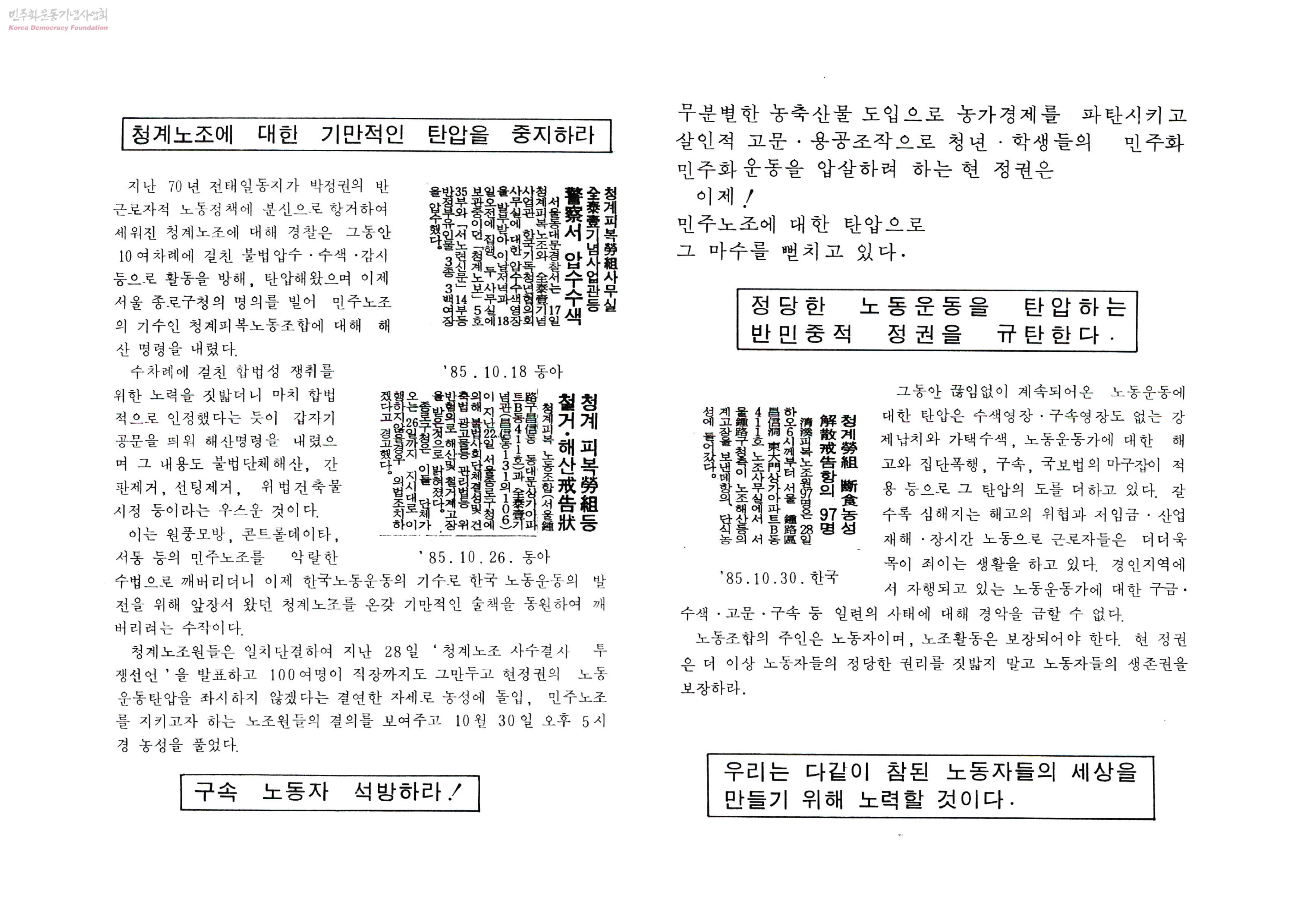 - 청계노조에 대한 기만적인 탄압을 중지하라 구속 노동자 석방하라! 정당한 노동운동을 탄압하는 반민중적 정권을 규탄한다. 등의 내용