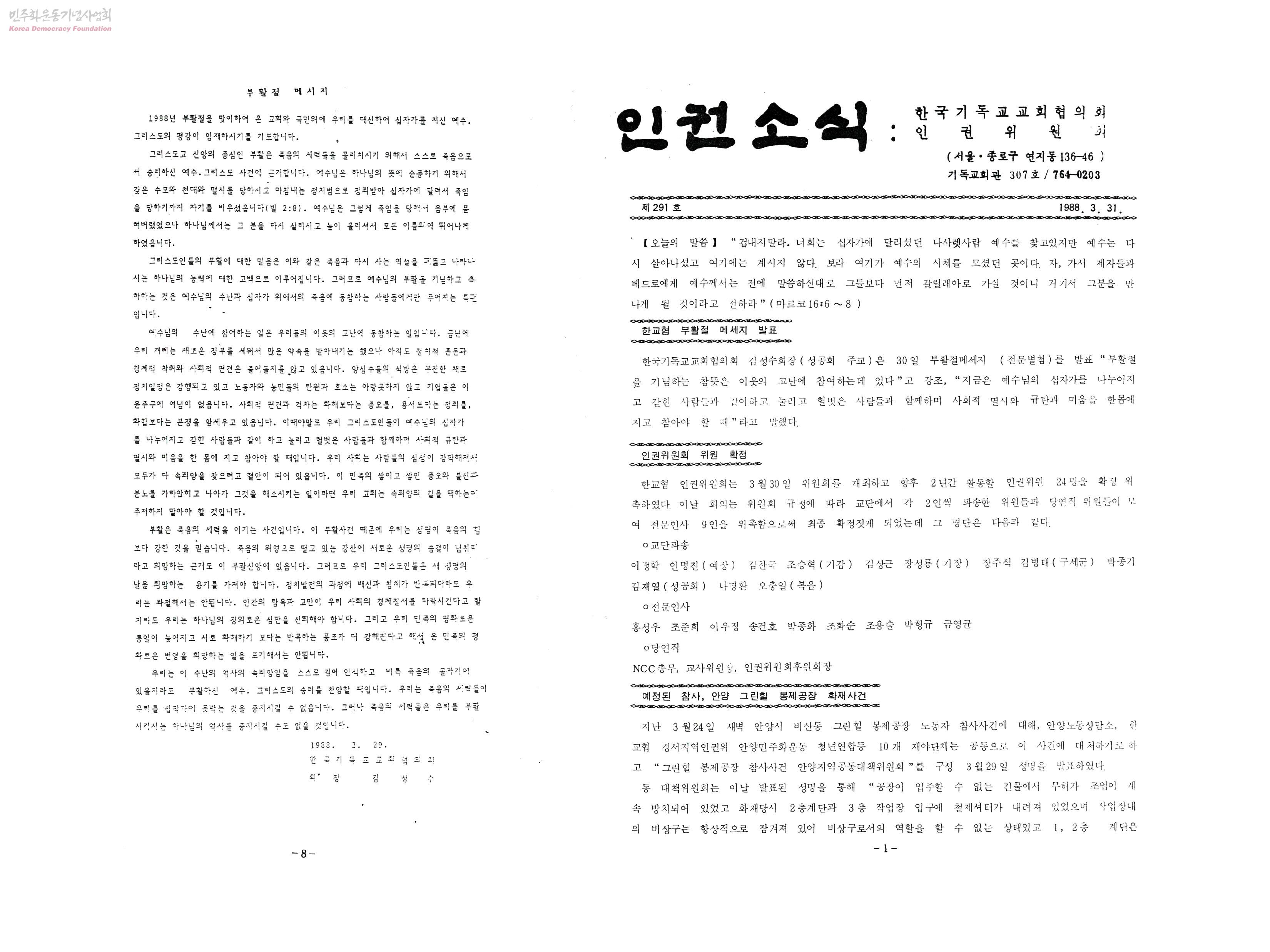 - 양심수 석방은 부진한 채로 정치일정은 강행되고 노동자·농민들의 탄원과 호소는 아랑곳없이 기업들은 이윤추구에 여념이 없어 이러한 사회적 편견과 격차는 증오와 분쟁을 일으키고 있지만, 쌓이고 쌓인 증오와 불신과 분노를 가라앉히고 우리 그리스도인들은 새 생명의 날의 희망하는 용기를 가져야 한다는 내용.