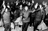- 1983년 9월에 출범한 '민주화운동청년연합'(민청련)을 필두로 1984년 6월에 출범한 '민중민주운동협의회'(민민협), 1984년 10월에 출범한 '민주통일국민회의'(국민회의)가 모체가 되었으며 '민주화운동과 민족통일운동은 하나' 라는 기본인식 위에서 노동자•농민•청년•언론 등 사회 각 분야의 민주화 운동단체들이 총망라되어 결성한 '민주통일민중운동연합'(민통련) 관련 내용. 1. 구속, 연행된 모든 노동자들을 즉각 석방하라. 2. 민주화를 가로막는 노동관계법 등 제악법을 즉각 철폐하라. 등