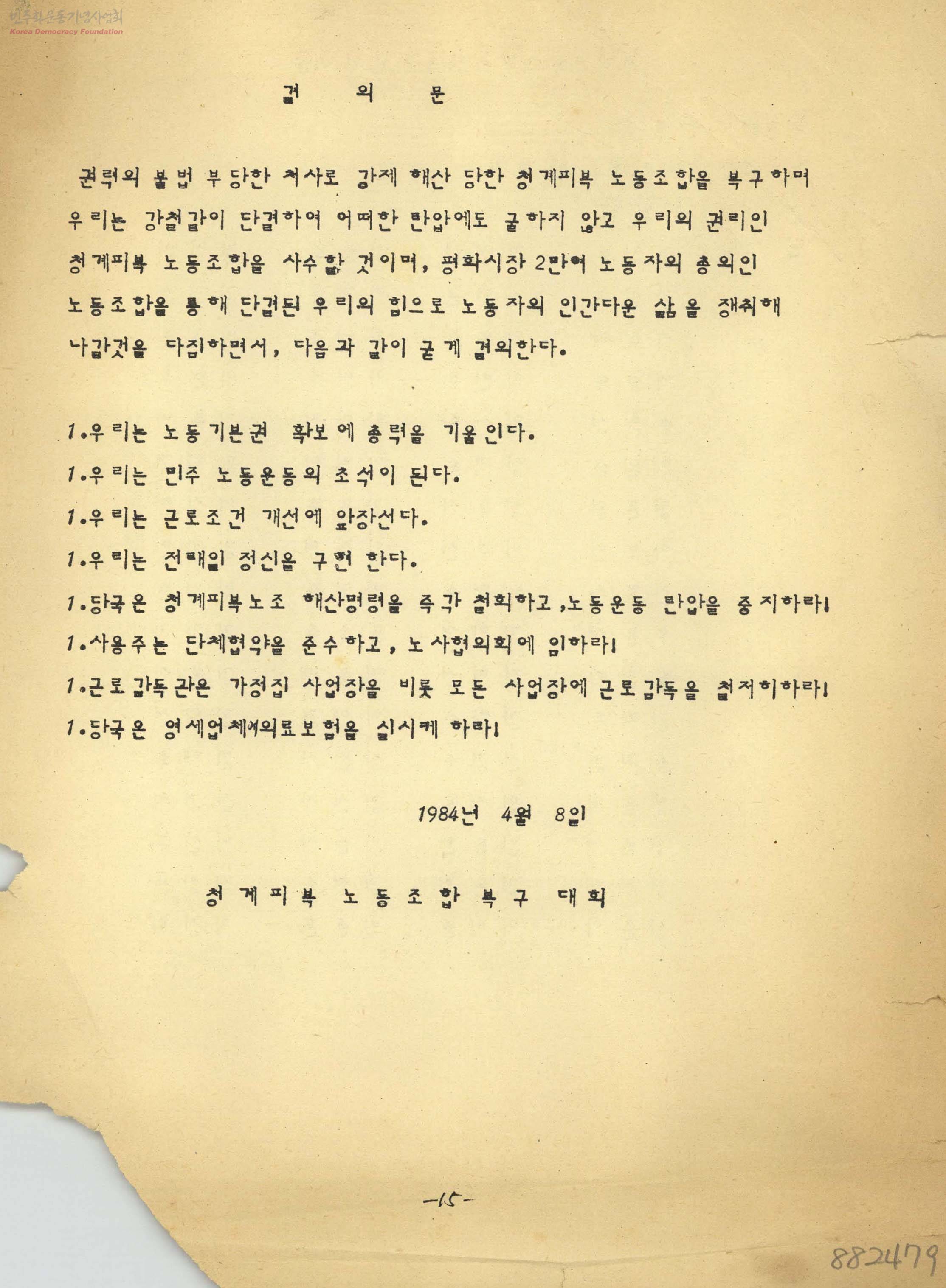 - 1970년 11월 27일 결성, 70년대 박정희 유신체제하에서 개정된 노동운동법으로 인해 노동조합운동에 대한 규제가 강화된 것에 맞서 노동자들이 자신들의 권리와 생계권을 위해 조직적인 투쟁을 전개하던 과정에서 건설된 청계피복노동조합 관련 문서. 강제해산 당한 청계피복노조를 복구, 단결하여 노동조합을 사수할 것이며 근로조건 개선에 앞장설 것을 결의