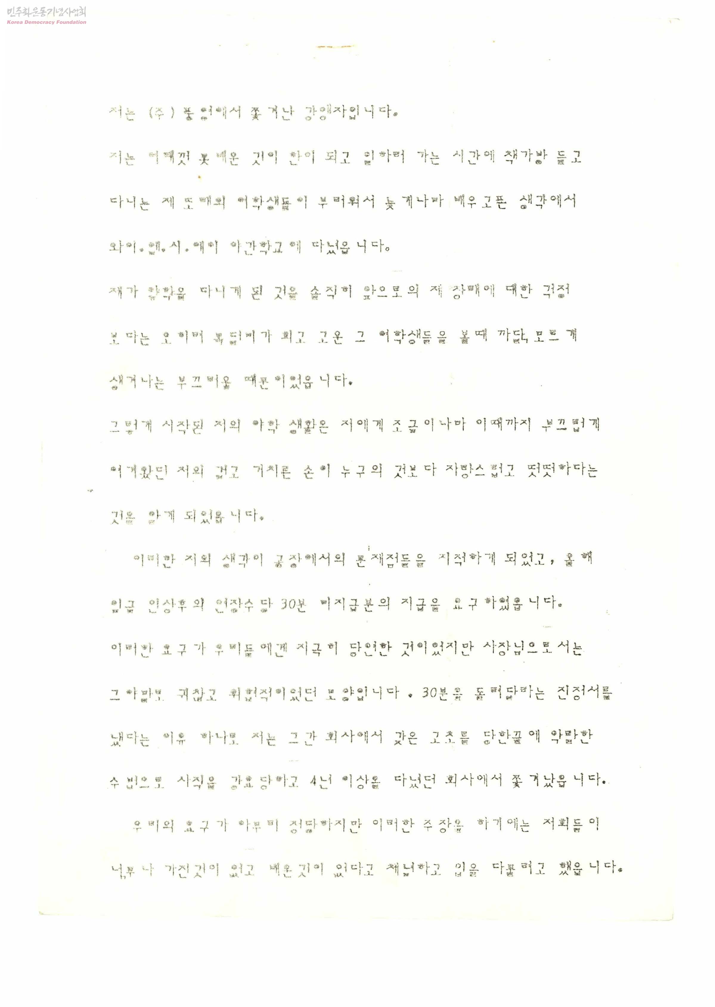 - ㈜풍영에 근무하던 노동자 강앵자가 야학을 통해 공장의 문제점을 인식하게 되었고, 임금인상후 현장수당 30분 미지급분의 지급을 요구했다는 이유로 4년동안 다니던 회사에서 해고당한 후 쓴 호소문으로 노동부와 폭력경찰의 부당함을 고발하는 내용.