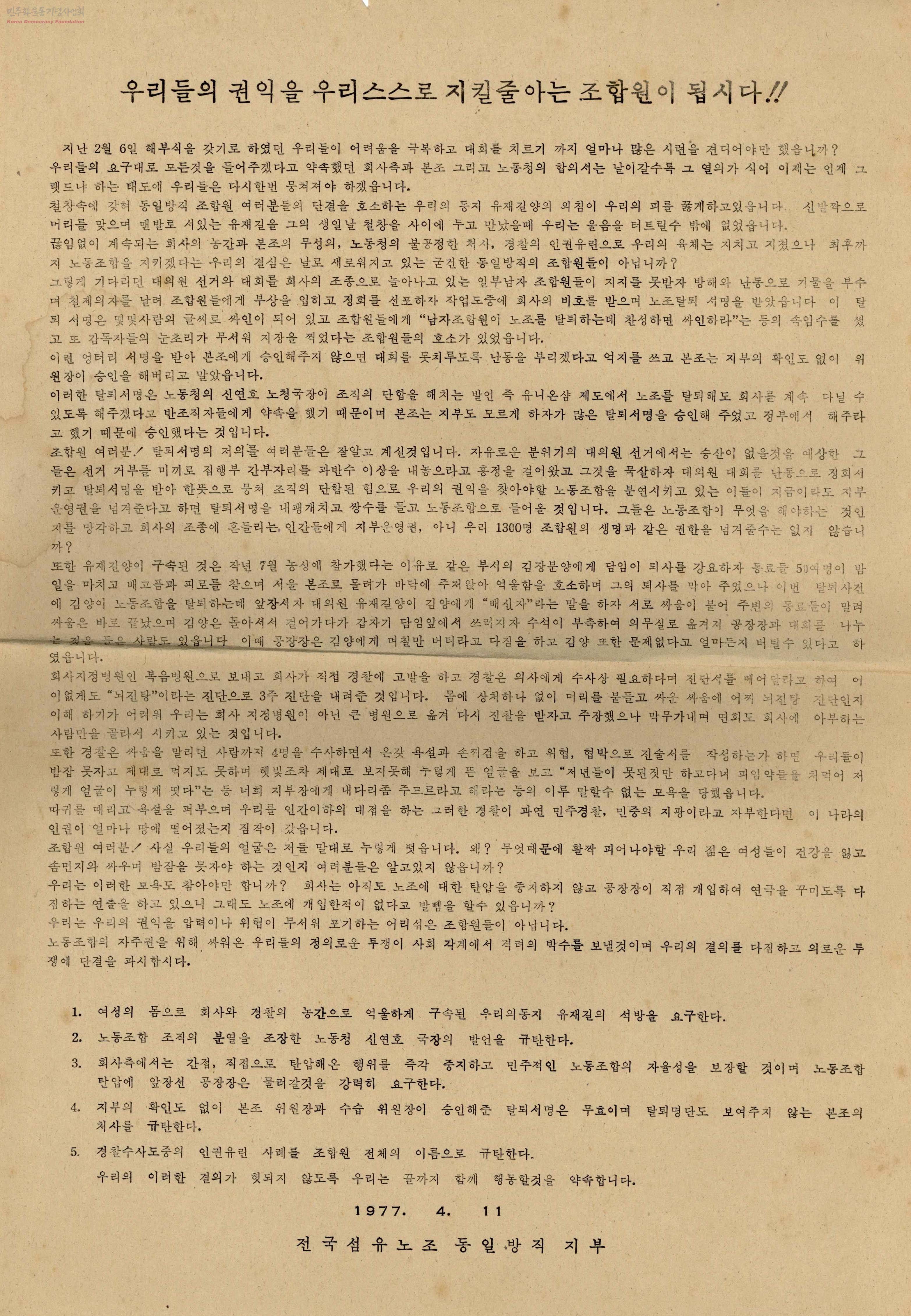 - 구속된 동일방직 조합원 유재길 양에 대한 경찰의 인권유린을 항의하며 -유지길의 석방 요구 -노동조합 조직의 분열을 조장한 신여호의 발언 규탄 -회사측에 노동조합 자율성 보장 요구