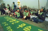 - 농가 부채 상환 적극 거부하자 외국 농축산물 수입 적극 저지하자 농민 생존권 보장하는 민주헌법 쟁취하자