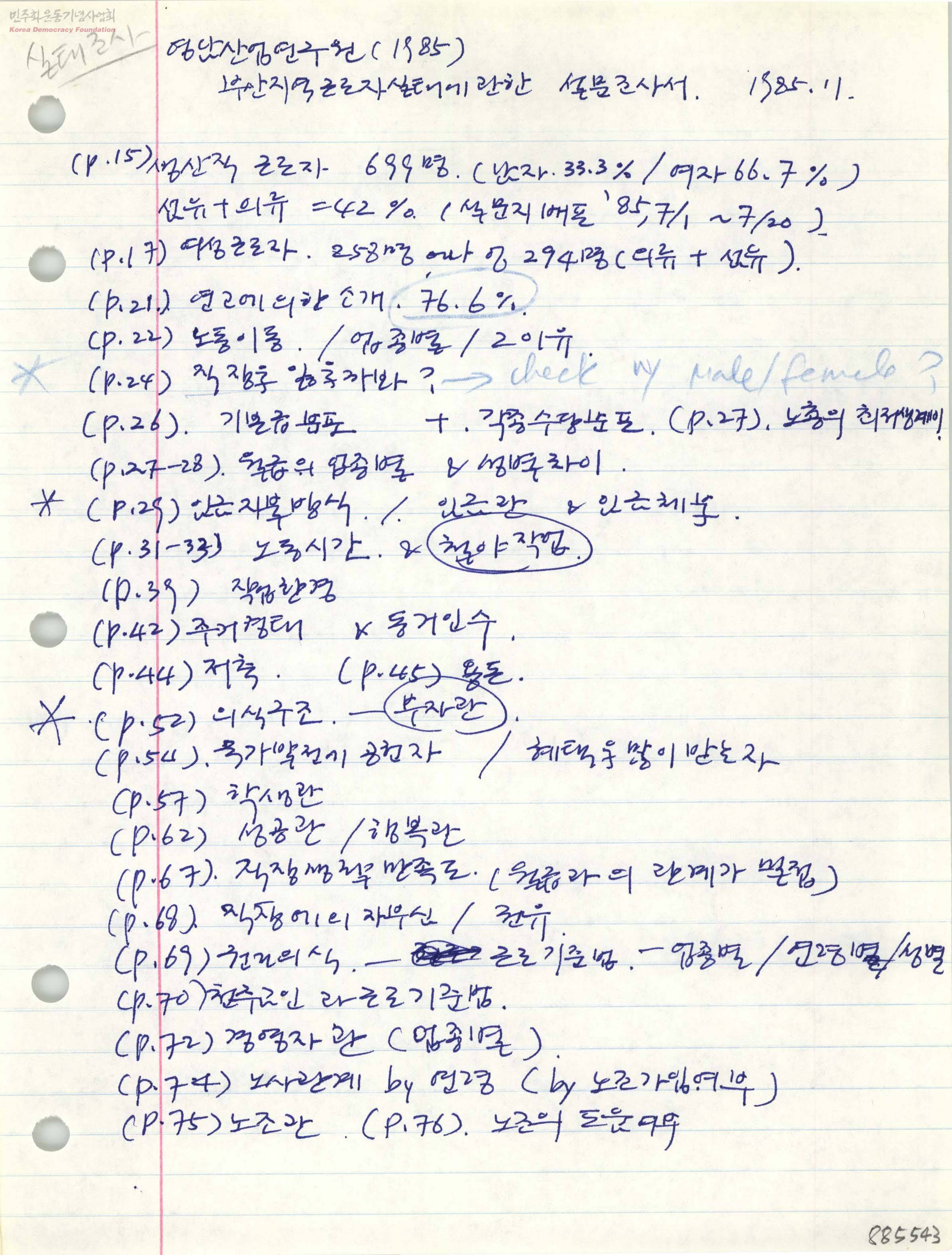 [85년 부산지역 근로자 실태에 관한 설문조사서 관련 메모]
