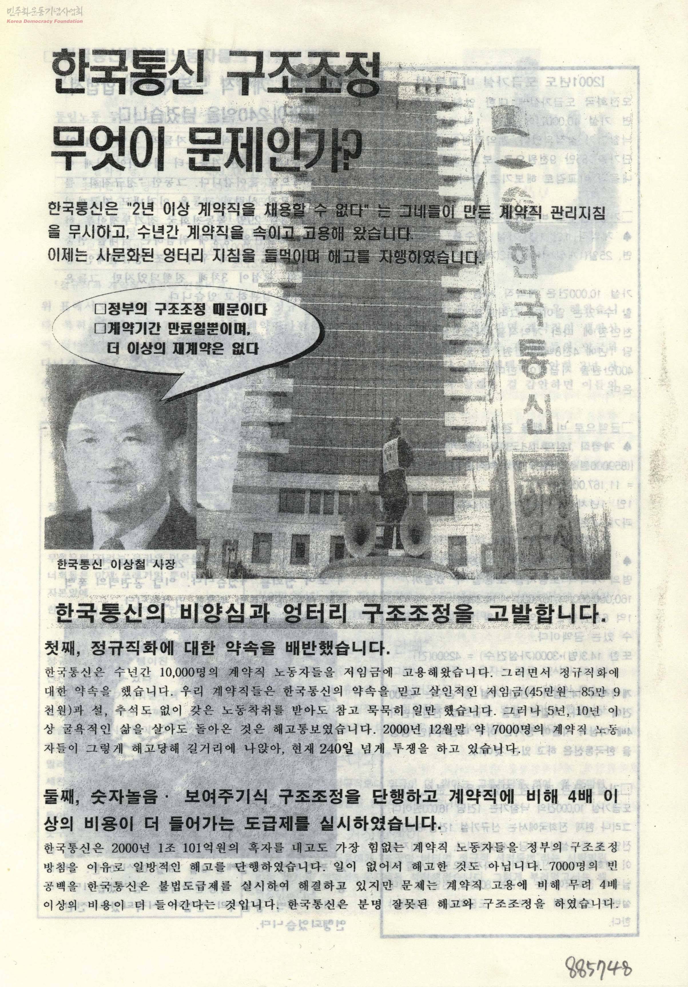 - -한국통신의 비양심과 엉터리 구조조정을 고발합니다. -한국통신 계약직 노동자들의 합법적인 파업이 240일을 넘겼습니다. -한국통신계약직노동조합의 요구사항과 향후 투쟁방향: 계약직 사원 중 1회 이상 계약 갱신자는 상시노동자이므로 정규직으로 전환을 요구함. -투쟁기금 마련 채권발행에 관한 협조문 등.