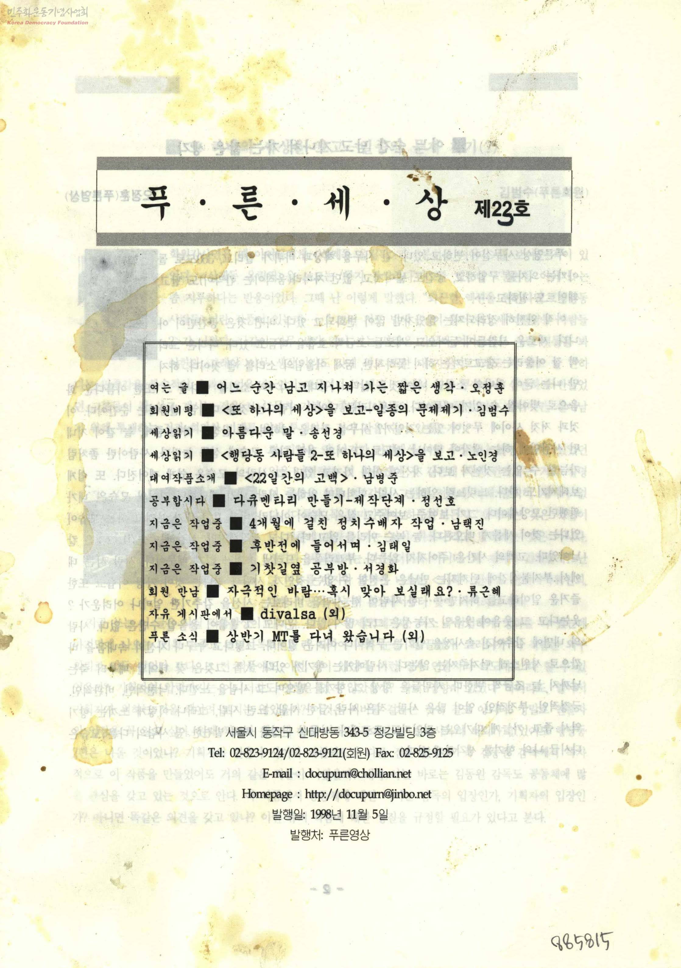 - 이 사회의 약자들이 살아가는 모습을 영상에 담는 푸른영상의 소식지 회원비평: '또 하나의 세상'을 보고 세상읽기: '행당동 사람들2-또 하나의 세상'을 보고 지금은 작업중: 4개월에 걸친 정치수배자 작업