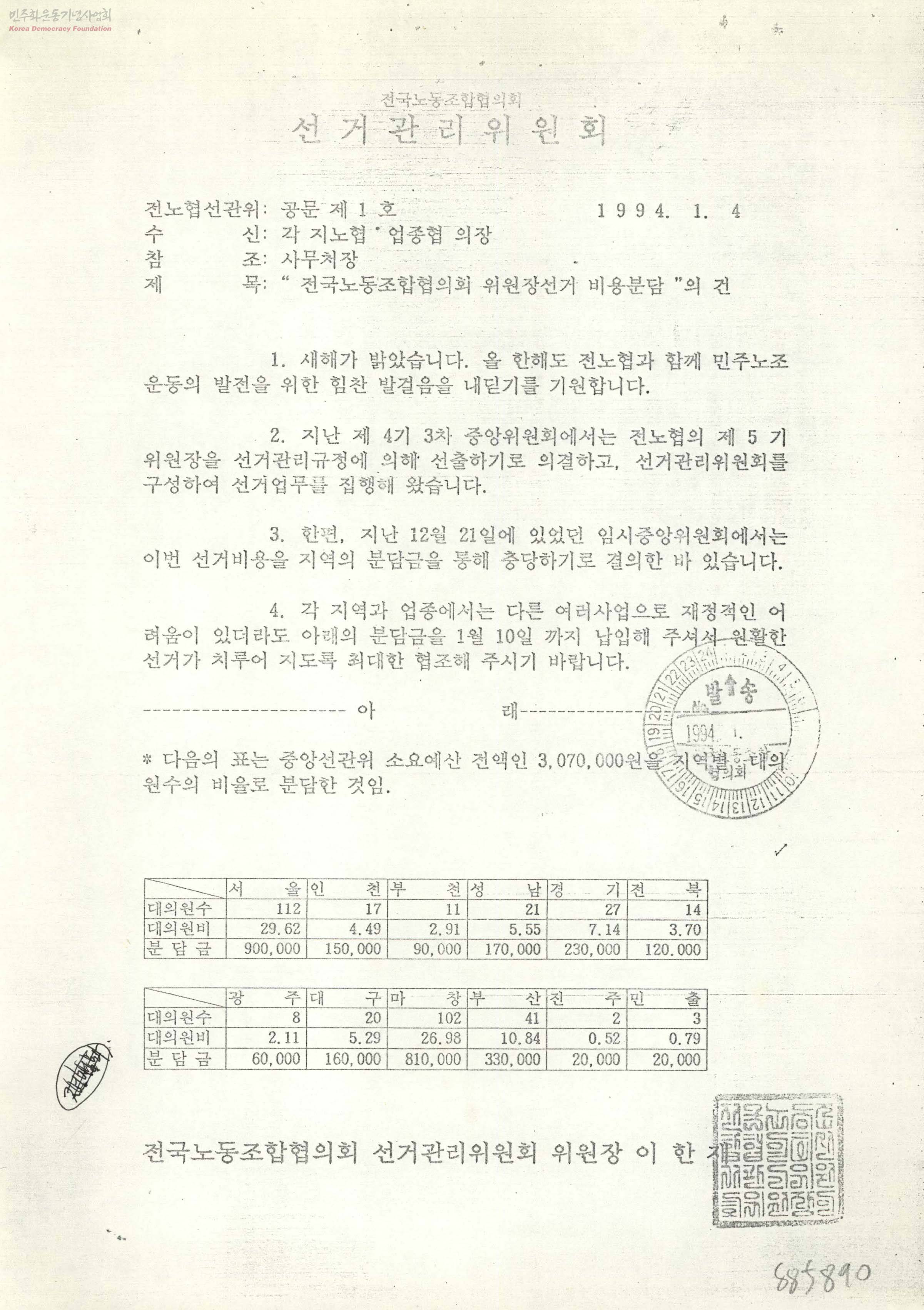 - 제4기 3차 중앙위원회에서 전노협의 제5기 위원장을 선출하기로 의결하고 선거관리위원회를 구성하여 선거업무를 집행하였는바 이에 대한 분담금을 입금하여 줄것을 요청하는 내용
