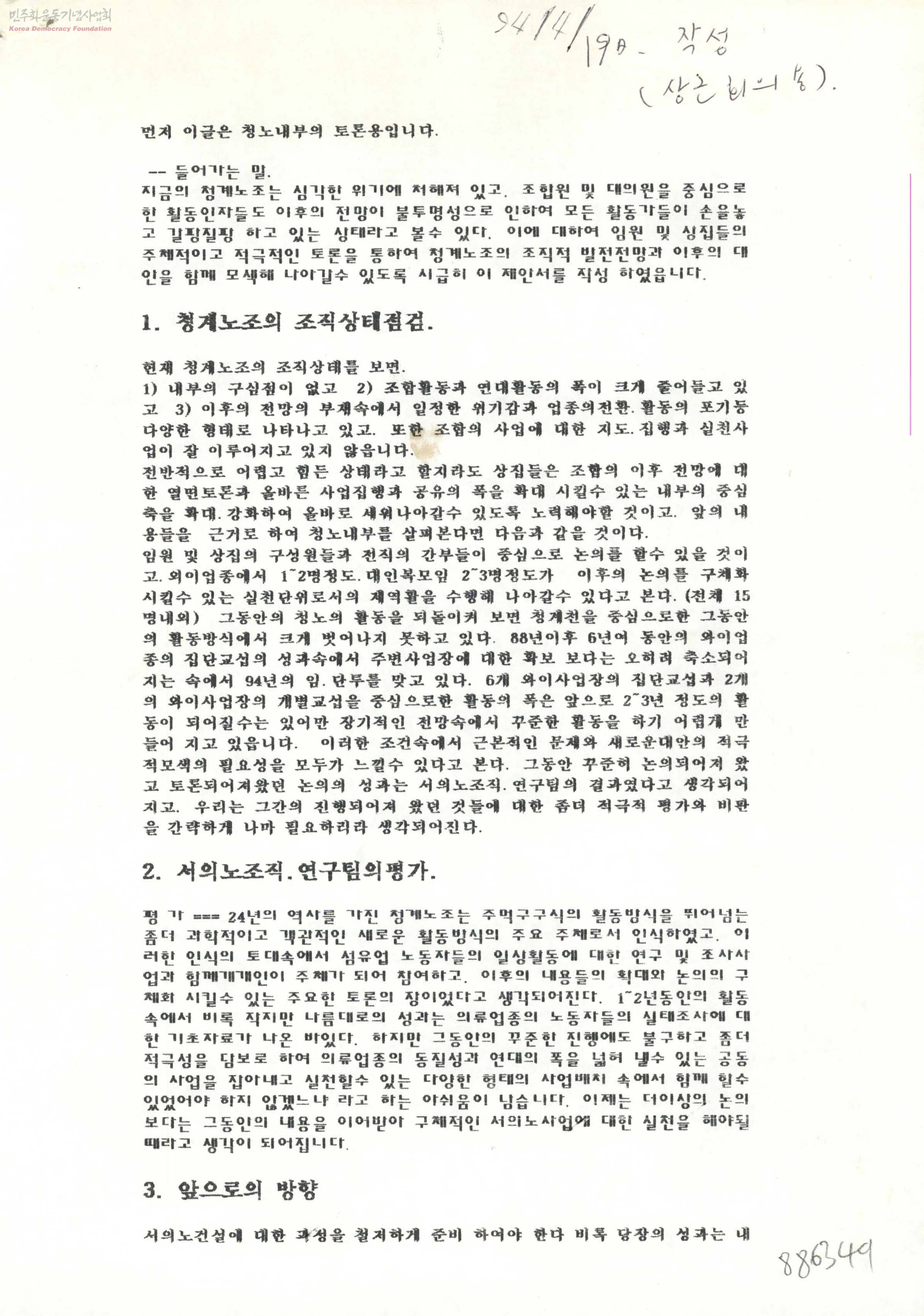 - 청계피복노동조합의 조직상태 점검 및, 서울의류노동조합 조직과 연구팀의 평가에 대한 알림, 앞으로의 노조 방향에 대한 내용