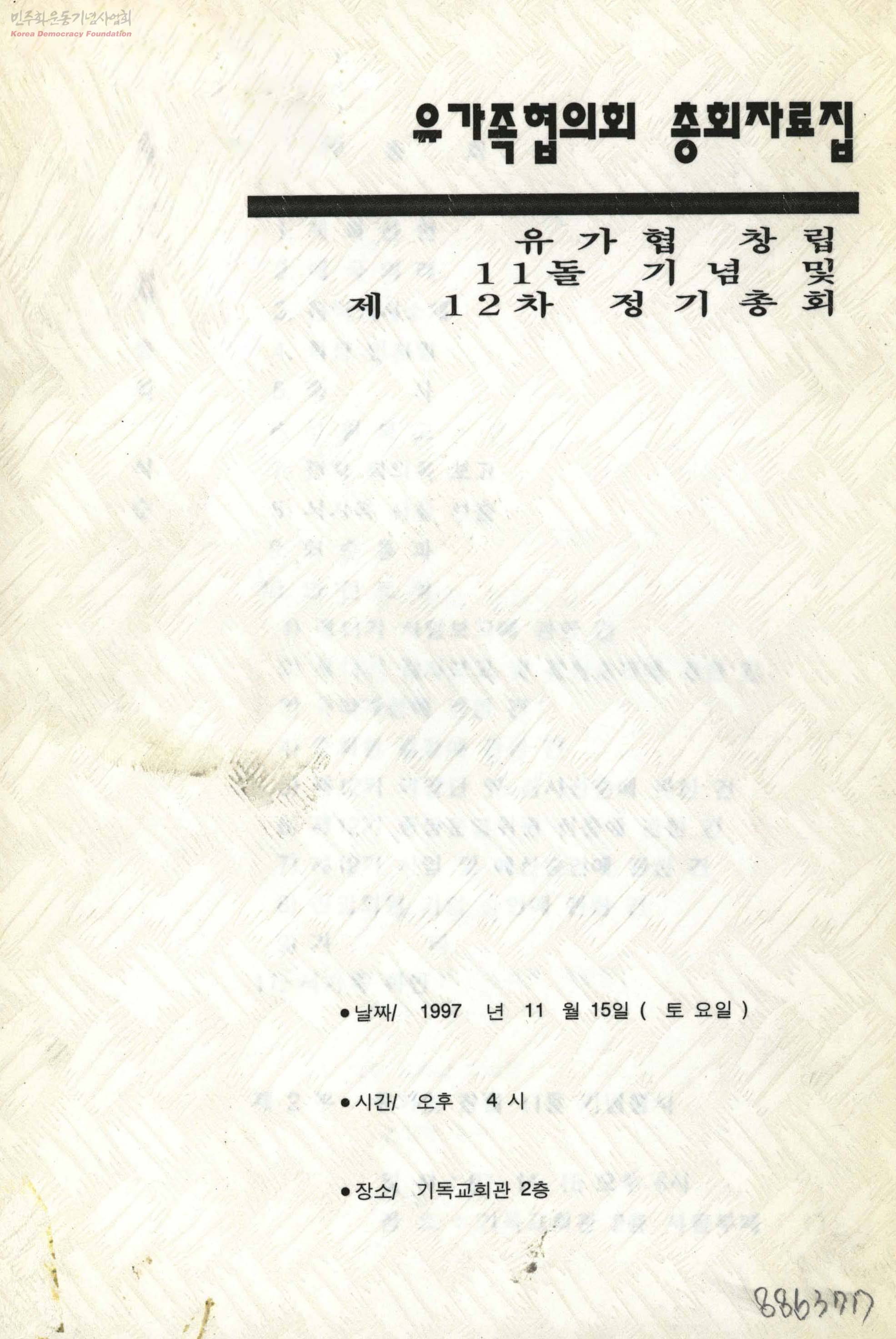 - 유가족의 단결로써 자주·민주·통일의 구국정신을 계승 발전시켜 인간다운 삶을 보장하는 세상을 건설하는 것을 목적으로 하는 유가협 총회 자료집. -제11기 사업보고·감사보고·결산, 규약개정, 의장단, 중앙운영위원 및 감사선출, 신입회원 가입 승인 등의 내용.