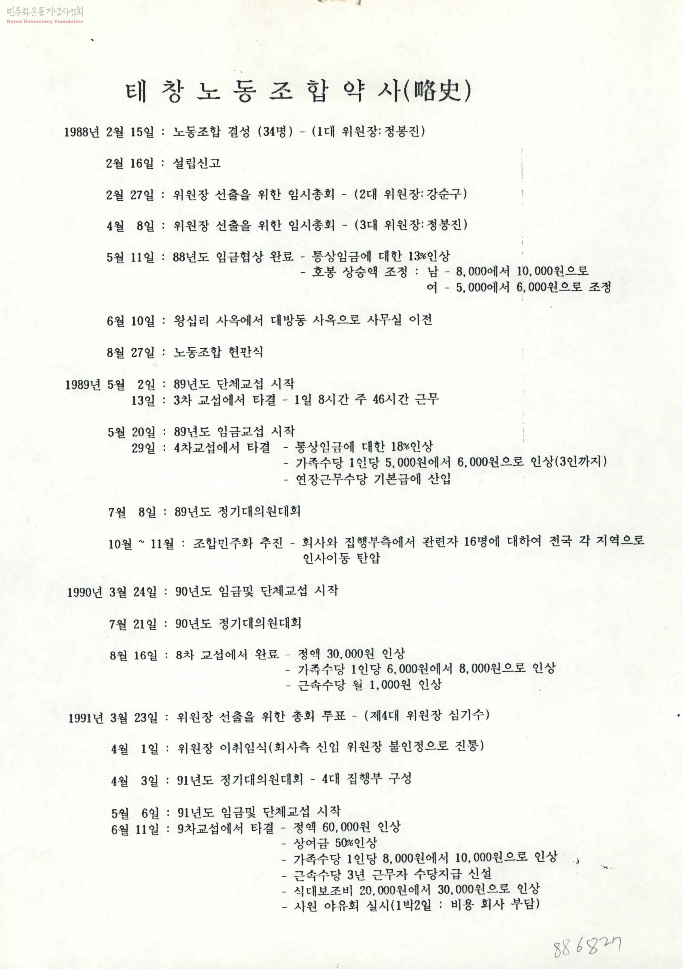 - 태창노동조합의 88년 결성으로부터 93년까지의 활동에 대해서 요약한 내용, 88년 결성과 설립신고, 현판식과, 89년, 90년 임금인상 투쟁, 91년 위원장 선출을 위한 총회 투표등에 대한 내용