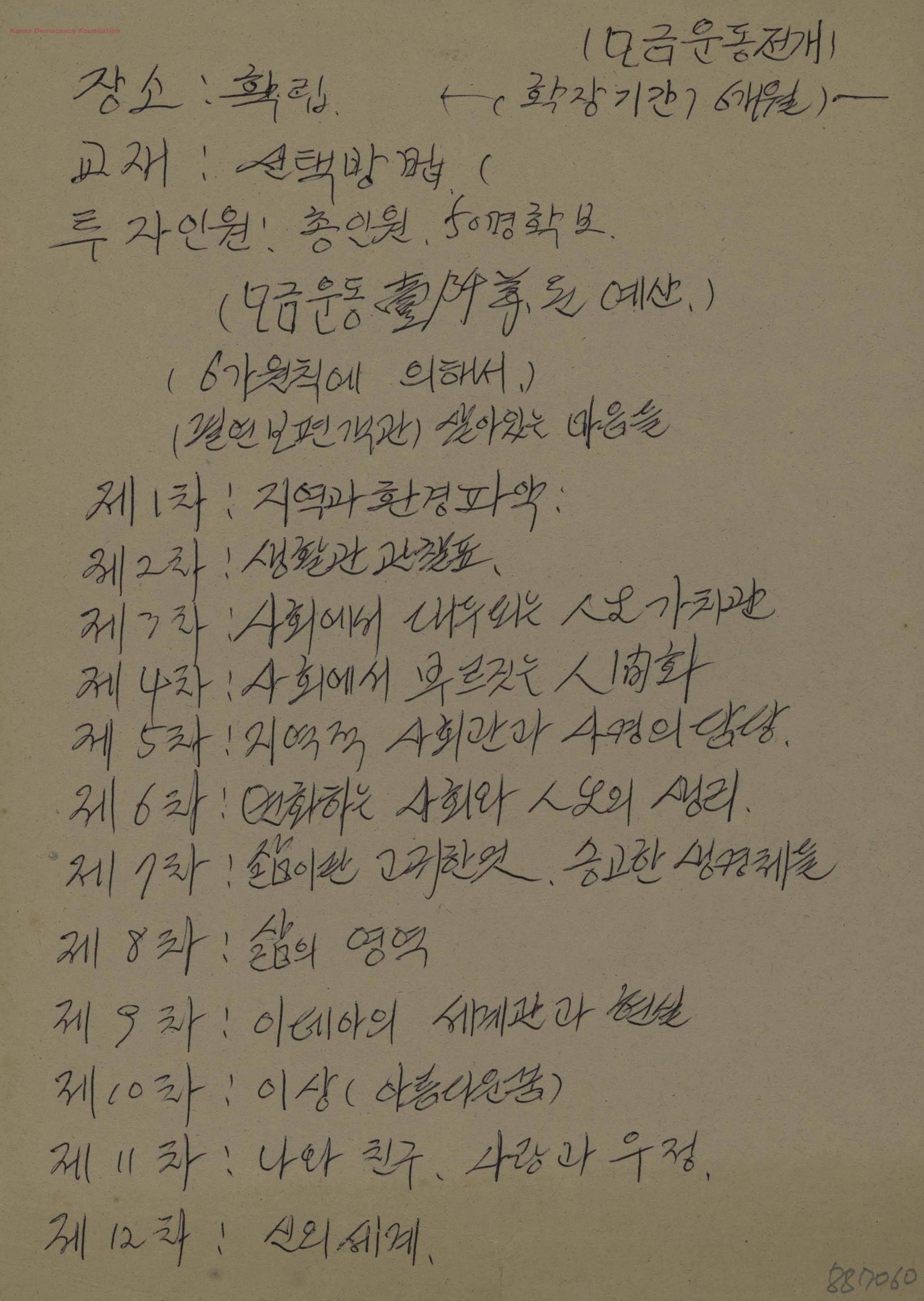 - 모금운동 전개 관련 메모로 확장기간과 교재 선택방법, 투자인원 총 50명 확보 등에 대한 내용과 1차부터 12차의 주제 등이 정리되어 있음.