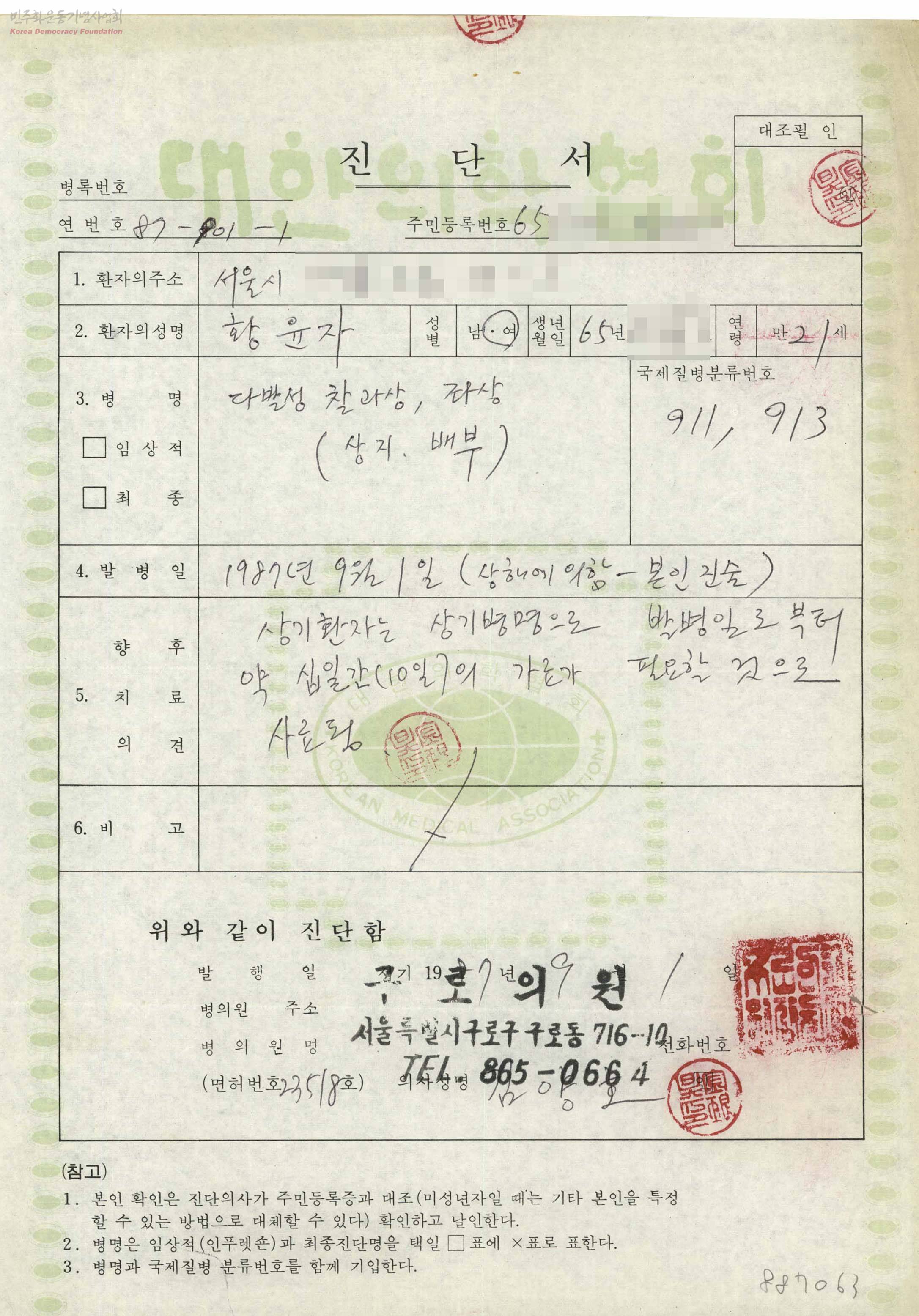 - 쟁의중 다발성 찰과상,좌상(상지.배부)을 입은 황윤자씨에 대한 진단서