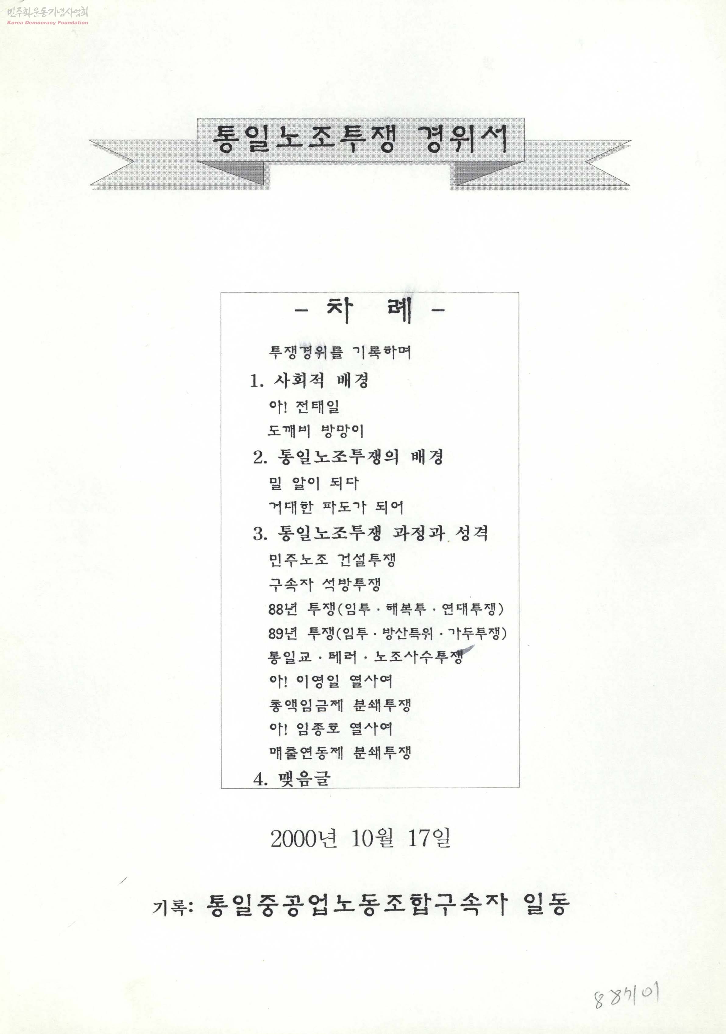 - 통일중공업 노동조합의 결성에서 부터 노조사수투쟁, 이열일 열사, 총액임금제 분쇄, 임종호열사, 매출연동제 분쇄 투쟁등 노조의 투쟁과정에 대한 경위를 엮은 내용