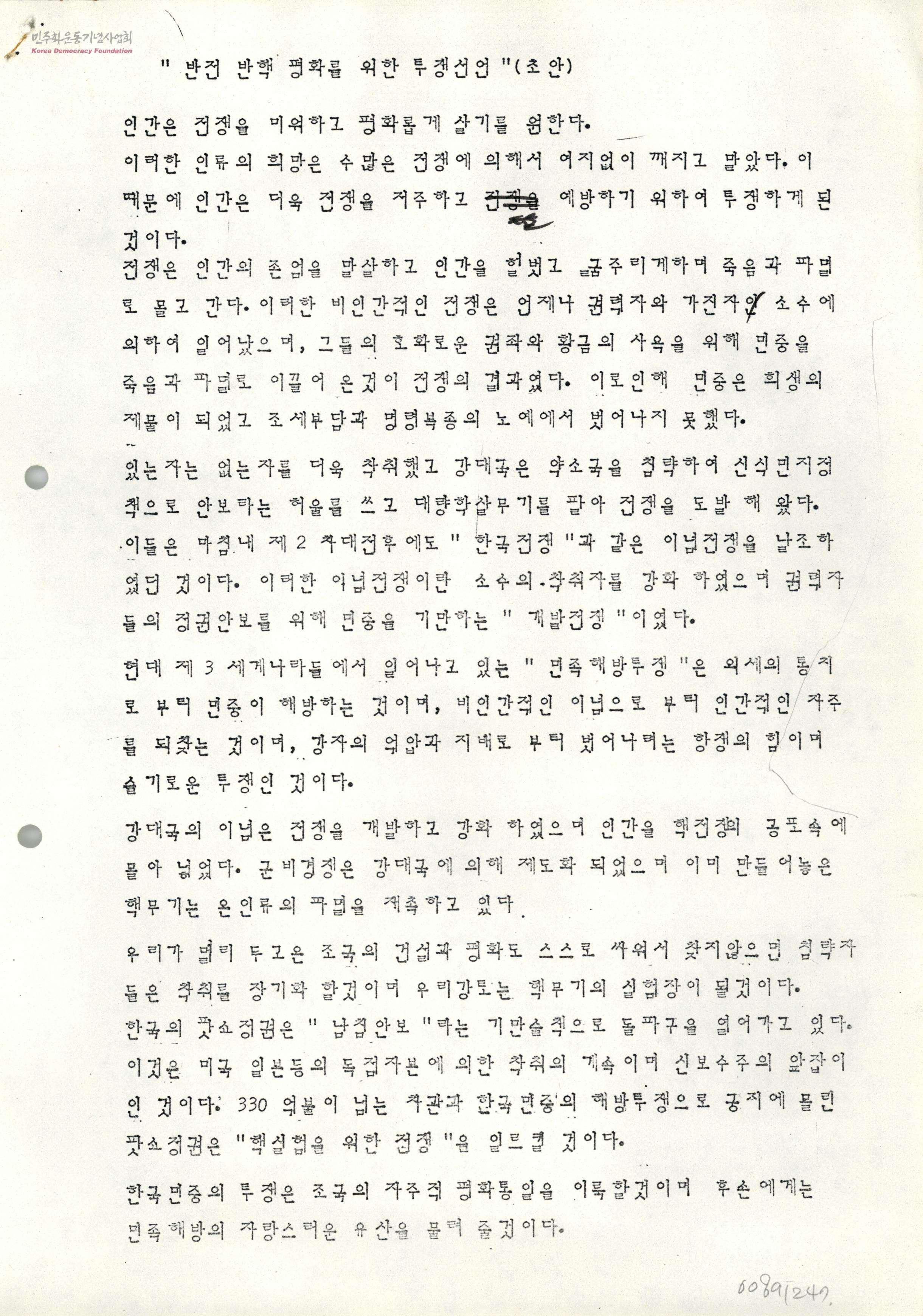 "반전 반핵 평화를 위한 투쟁선언"(초안)