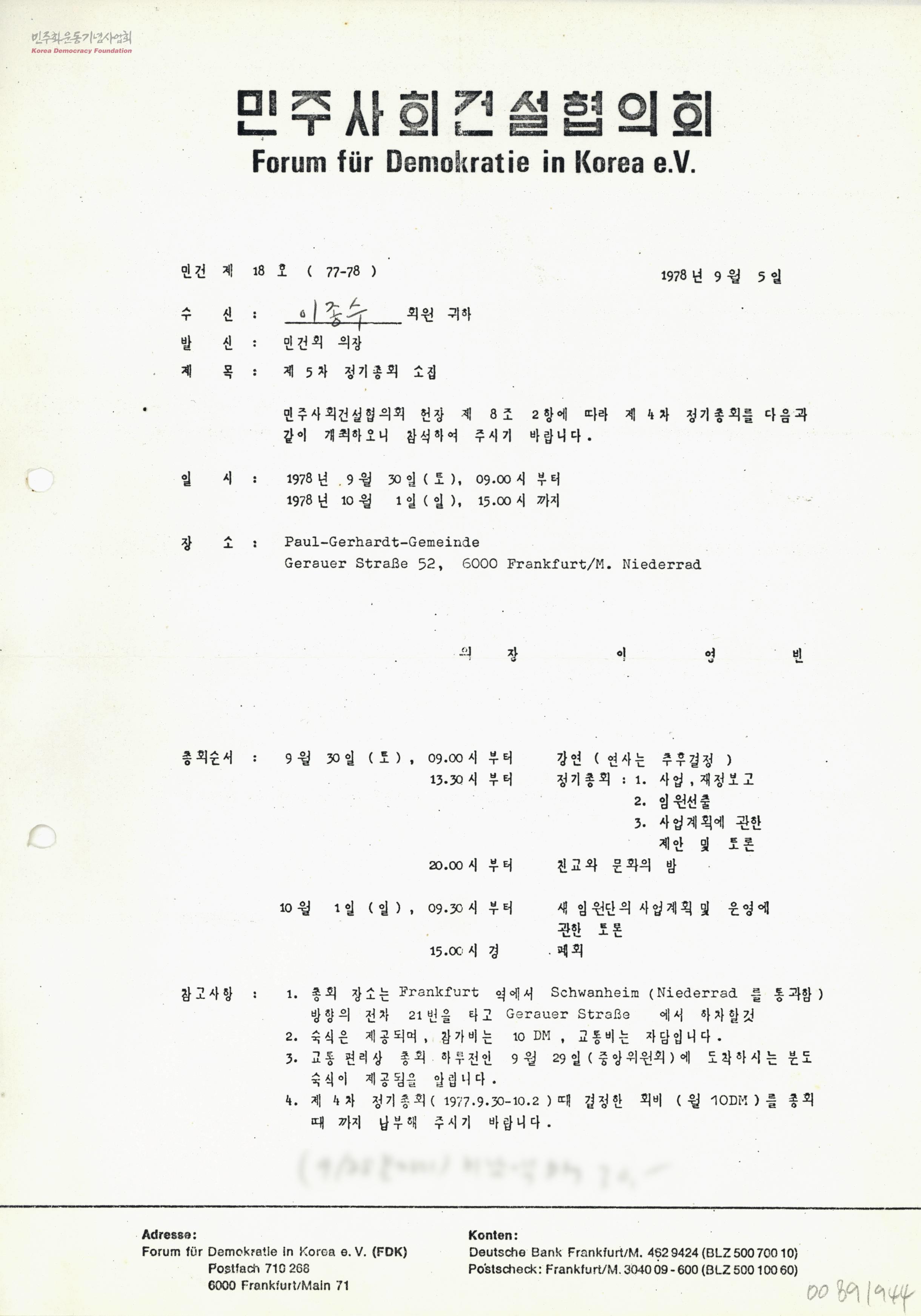 - 민주사회건설협의회 제5차 정기총회 소집 공문 일시: 1978년 9월 30~10월 1일