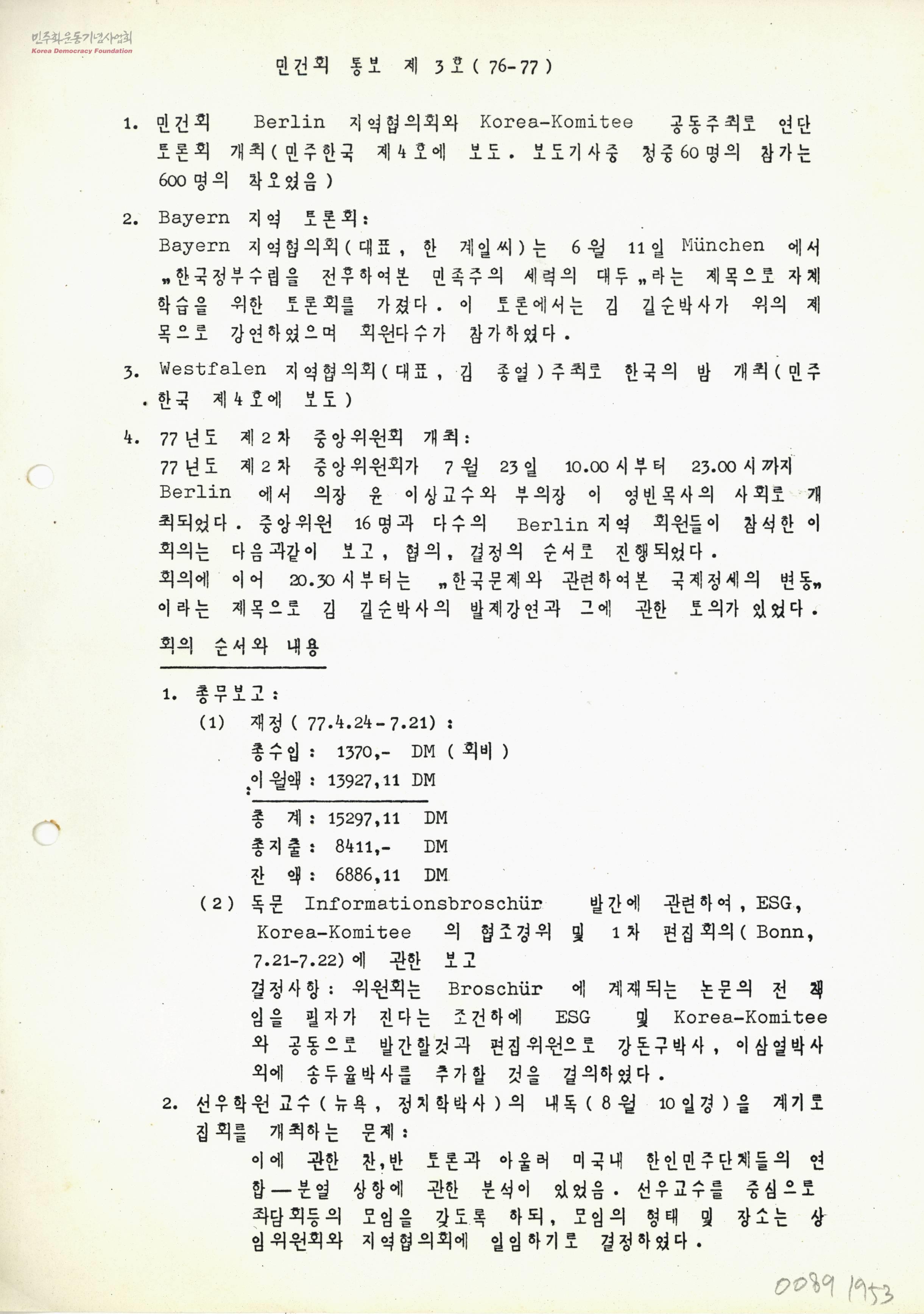 - 민주사회건설협의회에서 발행한 민건회 통보 제3호 1. 민건회 Berlin 지역협의회와 Korea-Komitee 공동주최 연단토론회 개최 2. Bayern 지역 토론회 3. Westfalen 지역협의회 주최로 한국의 밤 개최 4. 77년도 제2차 중앙위원회 개최 5. 민주구국헌장 서명운동 6. 회원의 징계절차 및 규정을 헌장 시행세칙으로 정함 7. 재정감사